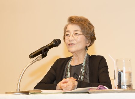 髙柳薫理事長から主催者挨拶があった後、さっそく倍賞千恵子さんの講演が行われました。倍賞さんは「歌うこと、演じること、そして生きること」と題して講演。松竹音楽舞踊学校を経て松竹歌劇団に入団、女優、歌手としてデビューした経緯から、映画「男はつらいよ」シリーズでのエピソード、「お兄ちゃん(寅さん)」への思いなどを、歌や朗読を交えて披露し、童謡や「戦意高揚」を図る歌詞