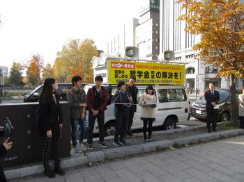 昼休みの一時間で各議員、川村先生、学生諸氏にマイクを握っていただき、「奨学金」制度の改善に向けての運動の主旨を訴えていただきました。