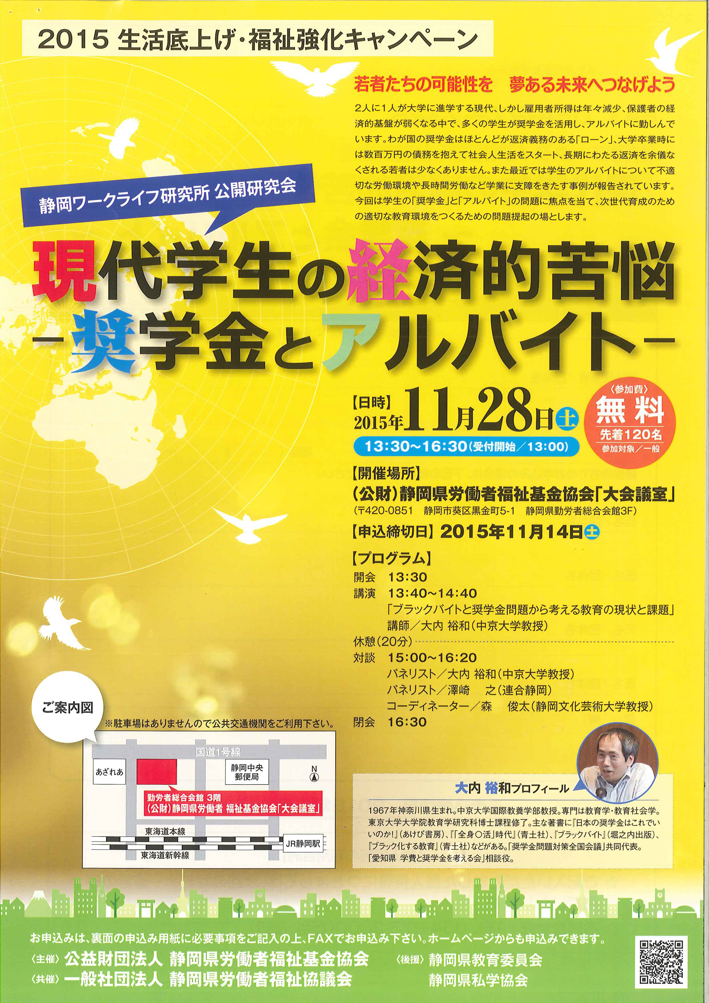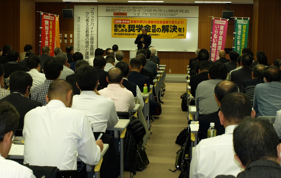 そして、街宣、署名活動の後、午後からALWFロッキーセンター(勤労者総合会館3 F)で福祉基金協会主催、県労福協共催の「奨学金問題 公開研究会」が開催されました。
