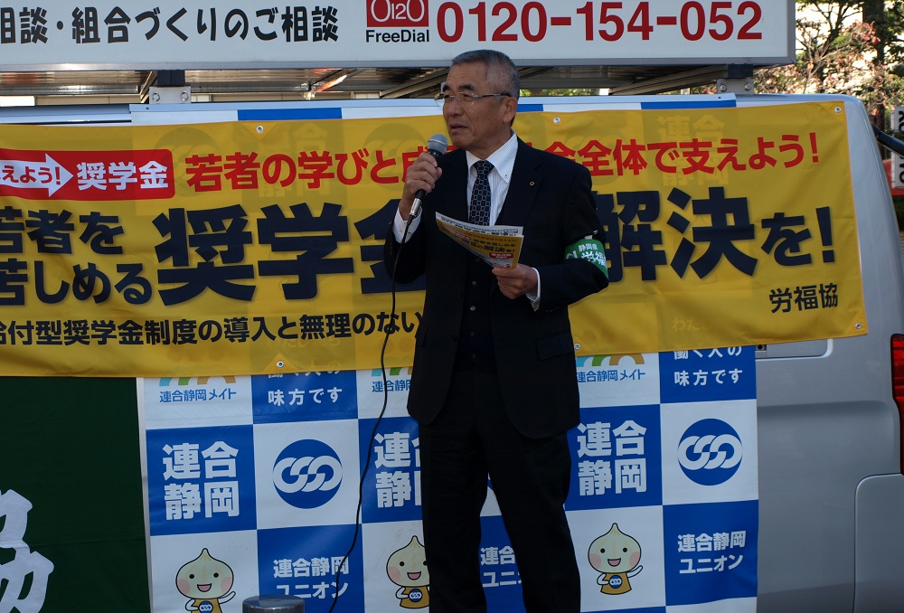 県労福協は連合静岡と連携し、11月28日(土)静岡青葉公園で街宣活動と署名活動を実施しました。