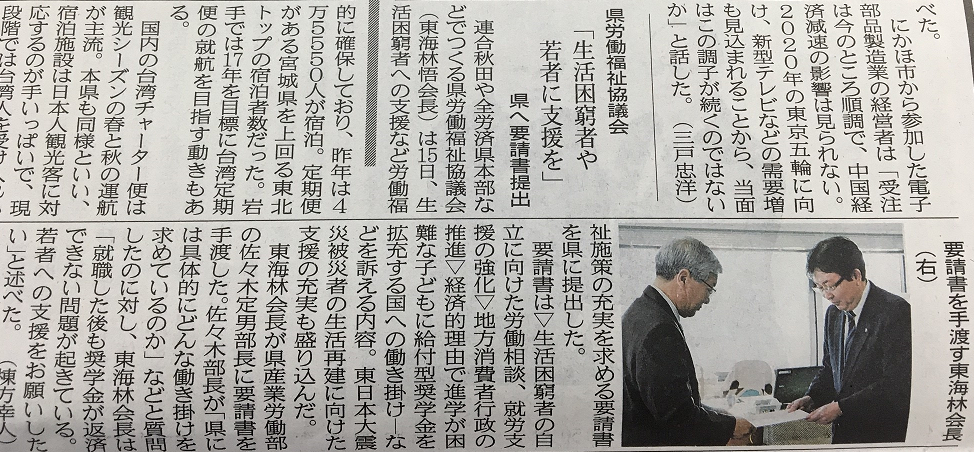 県側から「奨学金制度の課題については、子供や若者の貧困問題に関連しており県としても大きな課題と認識している。」とのコメントがあった。東海林会長から「奨学金制度については、現在労福協が中心となって署名活動など全国的な運動を展開している。状況を理解し改善に向け取り組んで頂きたい。」と提言した。
