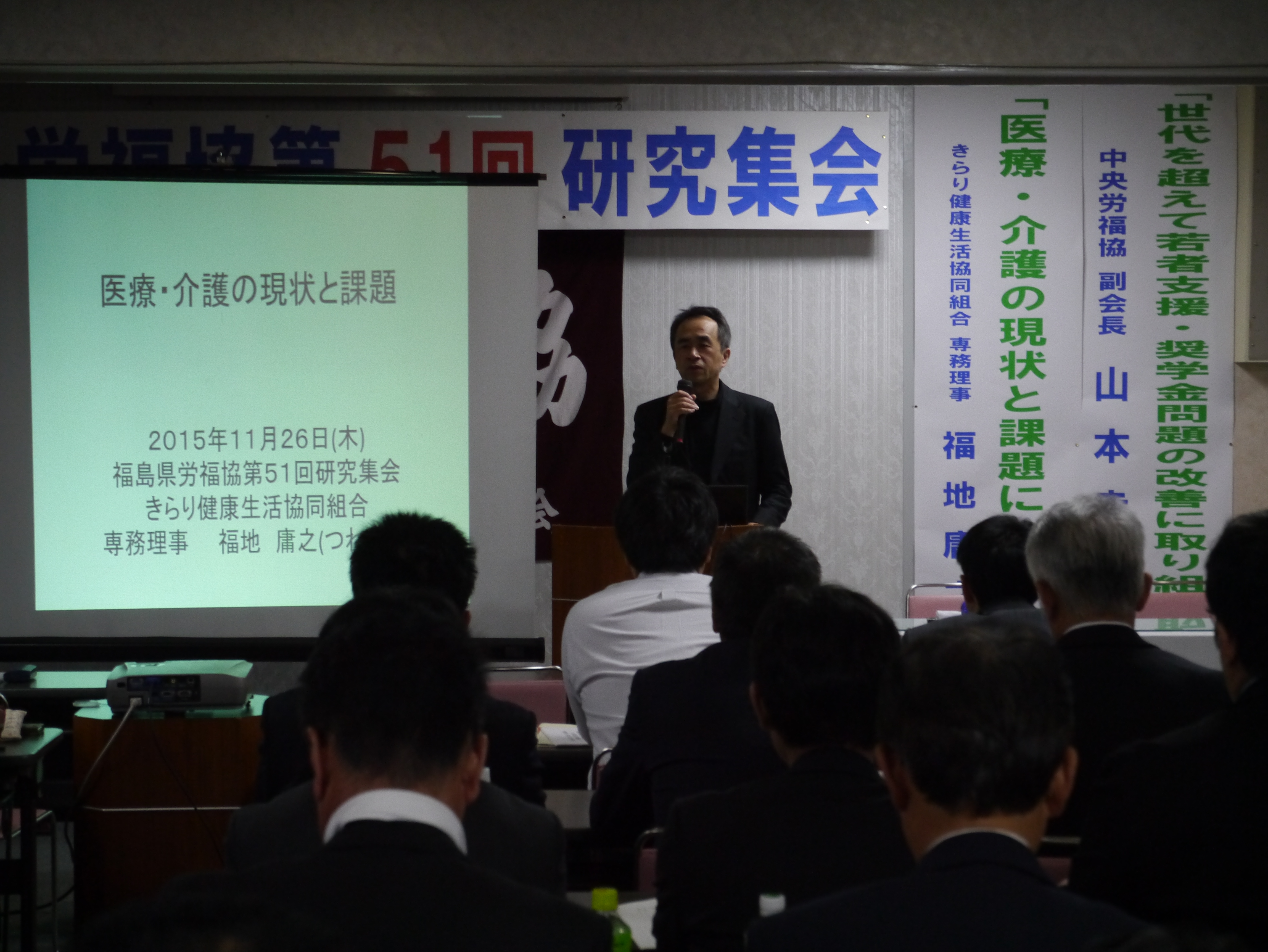 講演2は「医療・介護の現状と課題について」と題し、きらり健康生活協同組合の福地庸之専務理事(当協議会幹事)より講演を受けました。福地専務理事は「非正規労働者の増加や労働法の『改正』は、労働者福祉の更なる格差を生み続ける。政府は、小泉構造改革を上回る社会保障の削減(3300億円)を強行しようとしているので、医療・介護の問題は労働者福祉を守るためにはっきりと位置づけた運動の強化が必要である。さらなる格差拡大と『貧困の負の連鎖』を許さずに、地域の『助け合い』活動の推進を訴えました」。
