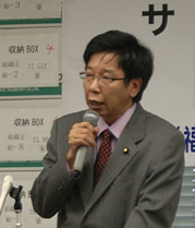 署名に胸が熱くなる。与党、自民党は冷たい。よほどしっかり闘わなければならない。自民党は自由でない。不自由党だ。非民主主義の政党だ。政治は弱いものためにある。原点に立ち返るべきだ。民主党を先頭に世の中を変えていきたい。自民党の中にも分かっている人がいるが、この集会に出てこれないでいる。民主主義は闘いだ。