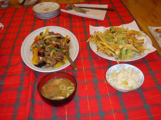 天ぷら・肉じゃが・牛肉と野菜の黒酢炒め・きのこ汁・さつまいもご飯