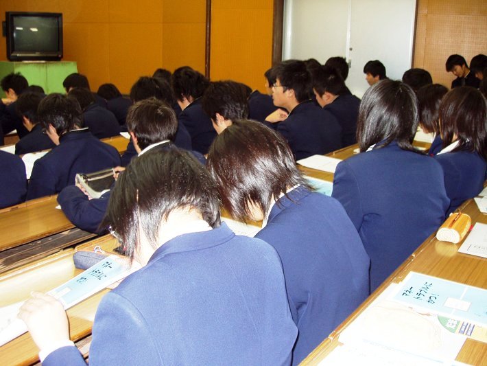 ◆ 本講座は3年生109名を対象にした授業の一環として同校の視聴覚教室で14:20~から開催された。