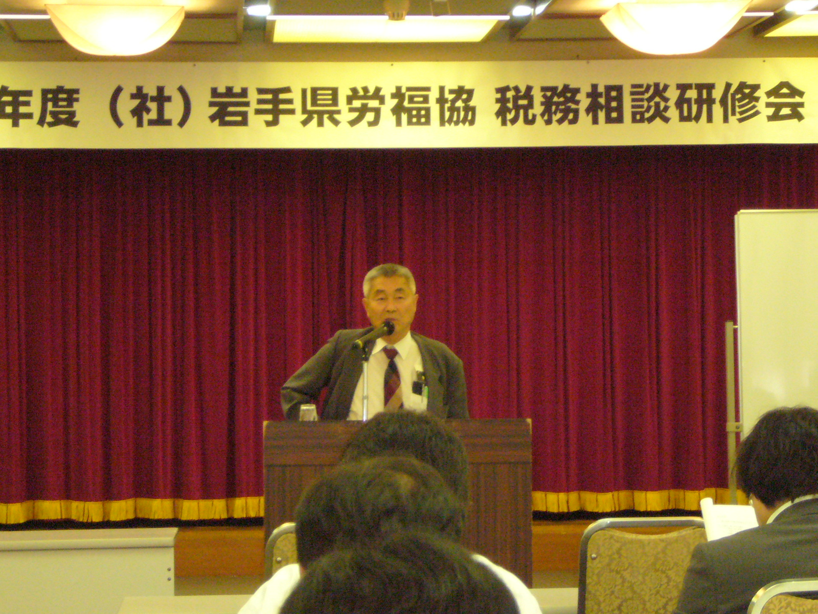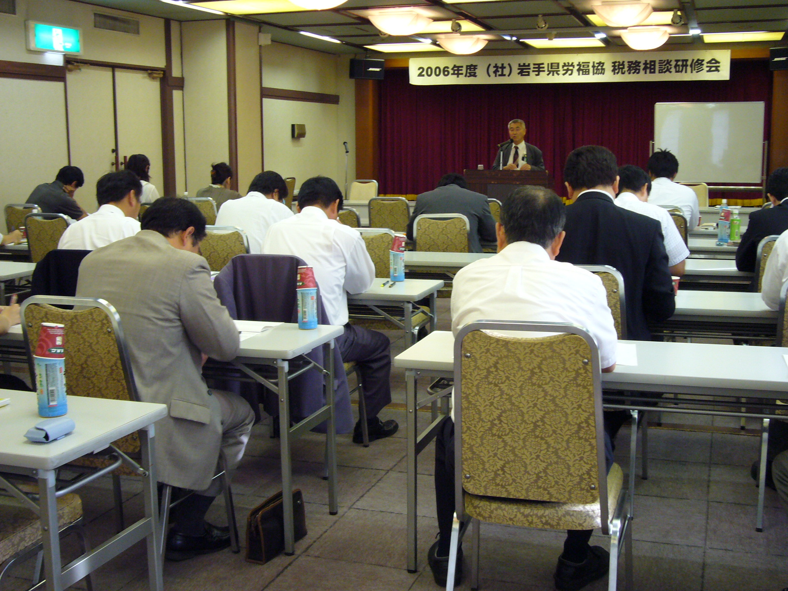 2006年度税務相談研修会を秋山信勝税理士を講師に招き、岩手労働福祉会館で開催しました。研修会には県内各地より25名が参加しました。佐々木敏男会長が主催者を代表して挨拶を述べた後、秋山税理士に今後の税制改正についてや公益法人に対する動向、労働組合の会計等について事例を交えながら分かりやすくご講義いただきました。