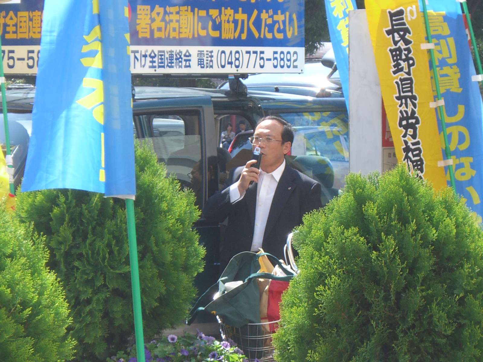 サラ金、クレジット、商工ローンの高金利引き下げを求め、全国各地を回る『クレ・サラ(消費者金融)高金利引下げ全国キャラバン』が9月25日(月)・26日(火)の両日、長野県内で街頭宣伝、署名活動を行いました。