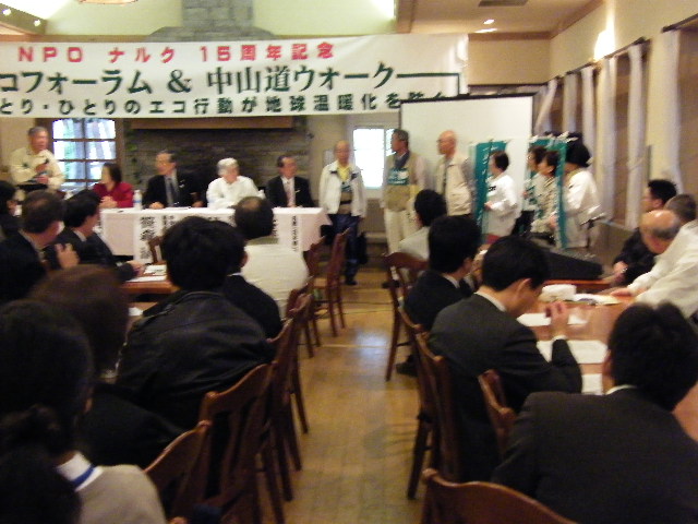 5月7日、NPO法人「ナルク」結成15周年を記念し「塩尻エコフォーラム」が塩尻市チロルの森で開かれました。このイベントは、ナルク主催により、本年4月25日に東京・日本橋を出発し、中山道を経由して、京都・三条大橋までを「エコふれあいウォーク」をしながら「私たちでできるエコ行動」を目的に中山道エコウォークとして日本橋から京都三条まで歩くイベントです。全長533キロを踏破する旅で、今回中間点である信州塩尻農業公園「チロルの森」で約100人が参加しフォーラムが開催されました。