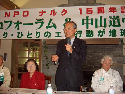 パネルディスカッションでは、「京都議定書」実現に向けた国民の参加と行動をテーマに討論され、パネラーとして中央労協会長笹森清(前連合会長)、永森昭紀名橋日本橋保存会事務局長(三越渉外担当部長)、茅野實長野県環境保全協会長(元八十二銀行頭取)、米窪千加代全国地域婦人団体連絡協議会副会長、高畑敬一ナルク会長(元松下電器常務取締役)の各氏が京都議定書の実現に向け地球温暖化防止をめざして、それぞれの活動や地球環境問題への想いなどが話され、中央労福協の笹森清会長は「今の日本は、我慢やもったいないという精神を忘れてしまった。便利な生活と、地球環境を守ることとの折り合いを付けていかなくては・・・」と延べました。