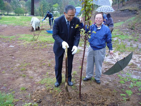 | 植林をする笹森中央労福協会長と原田県ナルク会長 |