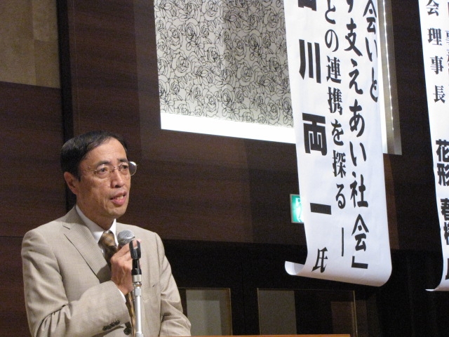 石川教授の基調講演は、「労福協・NPOの出会いと協働が生み出す支え合い社会」をテーマに、時代の大きな転換期を迎えて労働組合、自主福祉事業団体や労福協は役立つ道具として存続できるのか?そのキーワードは、社会性の奪還、地域の発見、自主福祉、NPOとの出会いと協働にあると指摘し、「時代の転換と勤労者が直面する課題」「組織と運動の社会性の奪還とNPOとの連携・・・要的存在としての労福協」「新たな出会いと協働を考える」などについて話されました。