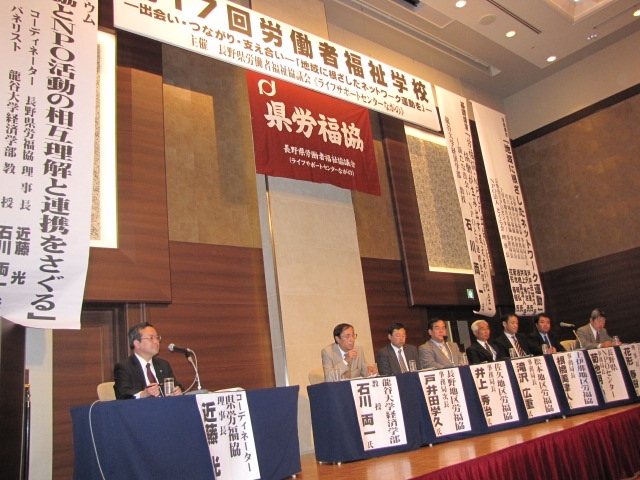 シンポジウムでは活動報告者が地区労福協やNPOの「課題や今後の目標、連携など」について発言、石川教授からは「労働組合の役員が地域の役員を引き受ける傾向にあるが、必要な人、やりたい人に任せることが大切」「団塊の世代が大挙して定年を迎え、地域でのコミュニケーション醸成、経験の場作りが必要」「協働の力で是非とも長野にもコミュニティ財団を作ってほしい」などのコメントがありました。