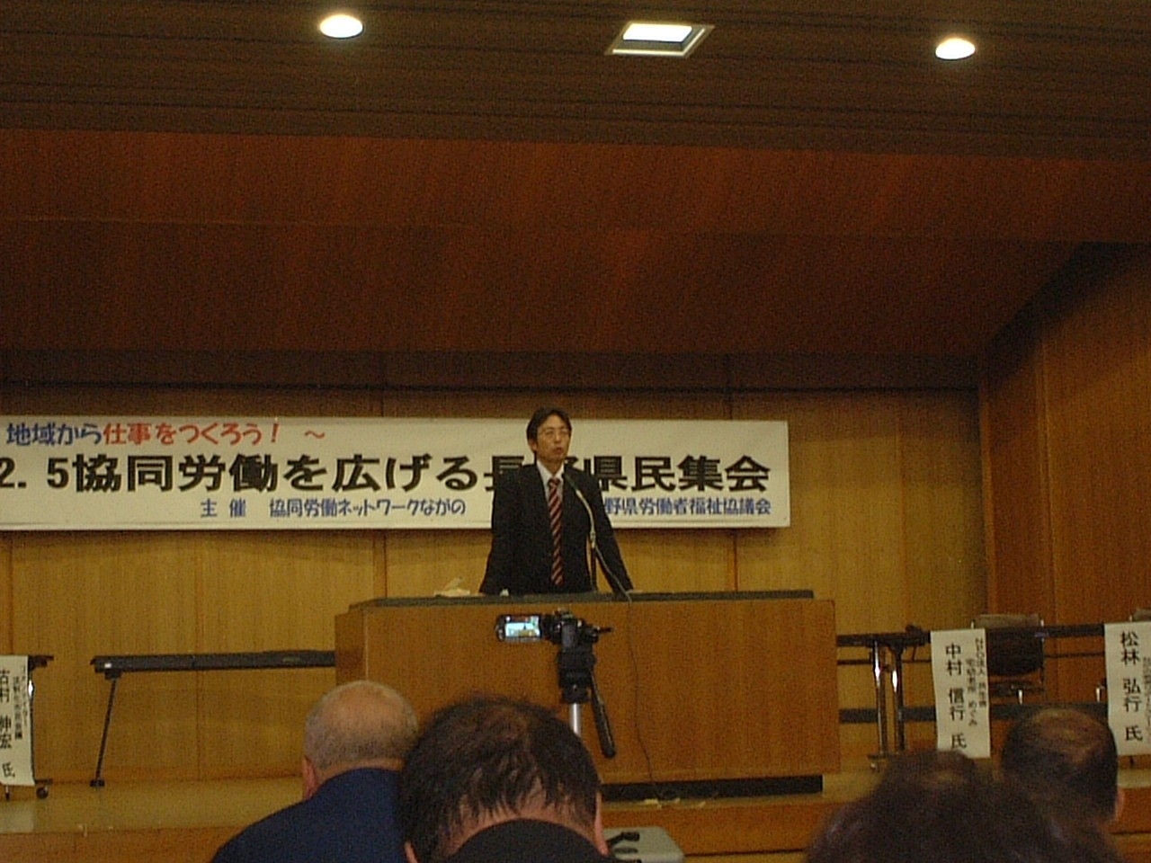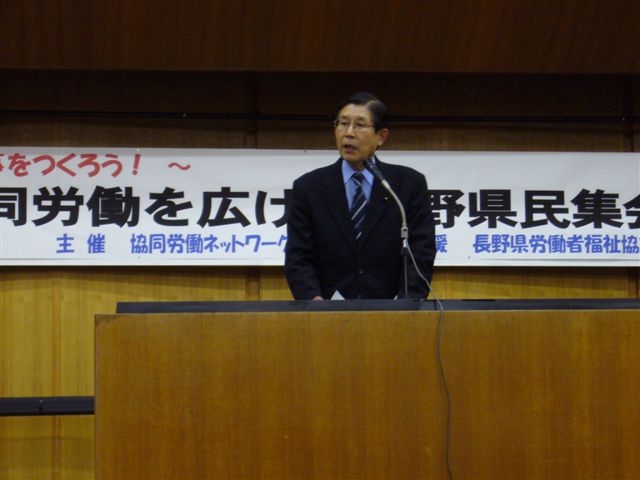 集会はまず主催者を代表し、青木建労協長野代表理事が挨拶、その後来賓を代表し倉田県議が「長野県内は高齢化が進み、第一次産業は本当に厳しく、農業や林業をこの協同組合が担っていけるよう、民主党県連幹事長としても民主党国会議員に早期制定を働きかけていきたい」と挨拶を行った。続いて法制化をめざす市民会議事務局長古村伸宏氏(ワーカーズコープ専務理事)が「市民がつくる仕事と地域~『協同労働の協同組合』法制化の可能性」と題して基調講演を行った。