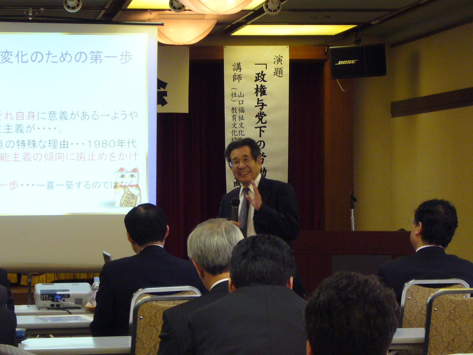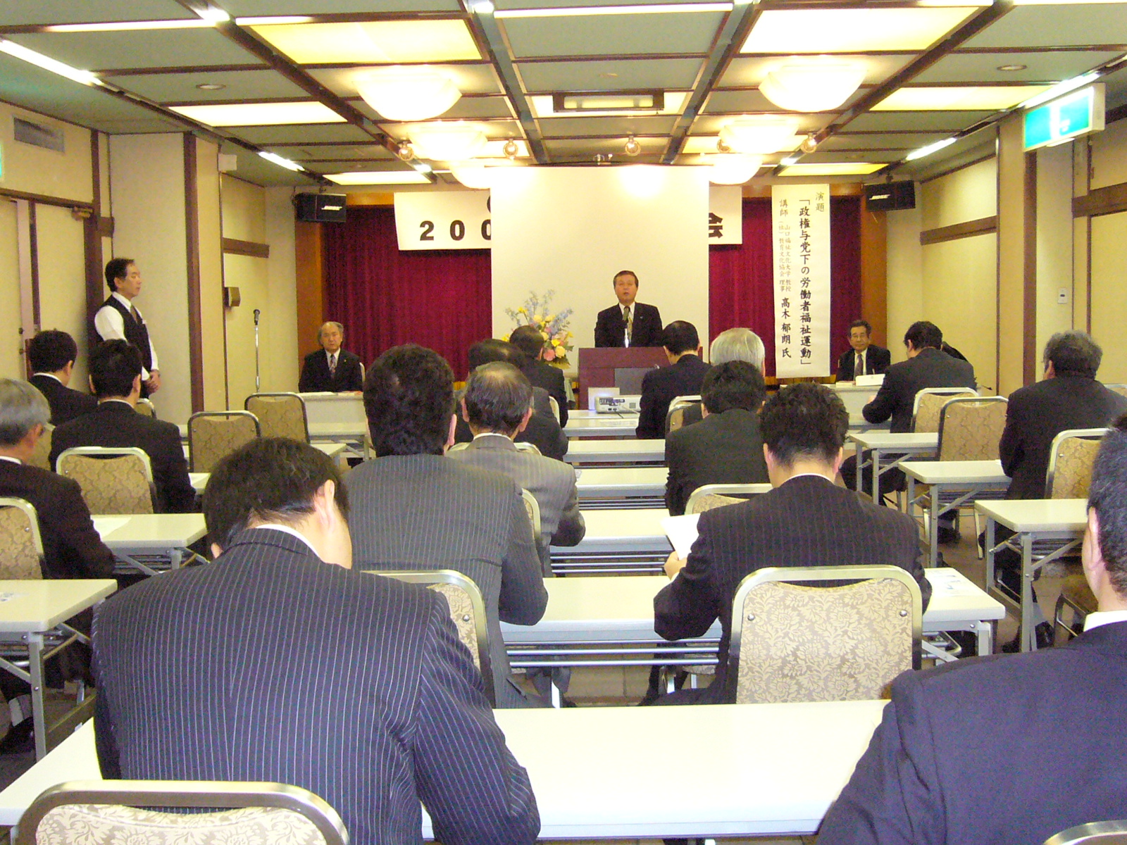 当日は、砂金文昭会長の挨拶、そして山口福祉文化大学の高木郁朗教授より『政権与党下の労働者福祉運動』と題して講演が行われました。