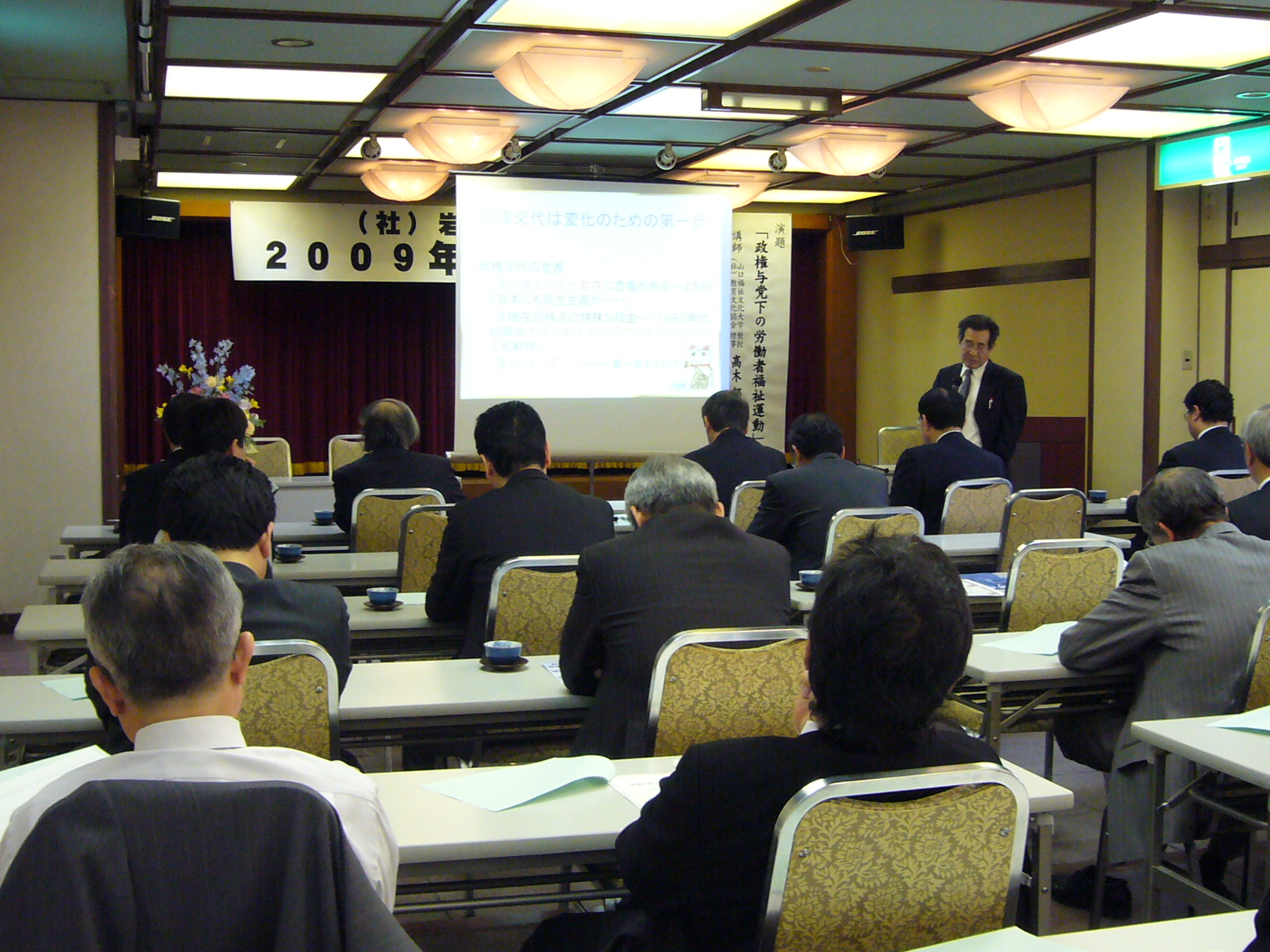 講演では、「将来を見据えてしっかり労働者の福祉のためのシステムを作る努力をする必要がある」「幸せのために必要な資源として、4つの生活資源(①所得②時間③社会サービス④人間関係)の整備が必要である」「政権交代は労働者福祉の確率のチャンスであり、そのための課題(①共助の対象を拡げる②共助内容の再点検③政策提言機能の強化④人材育成)の克服が必要である」と講演を締めくくった。