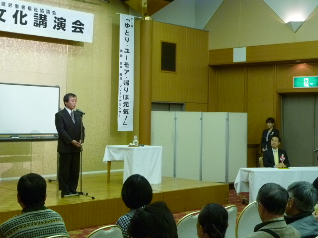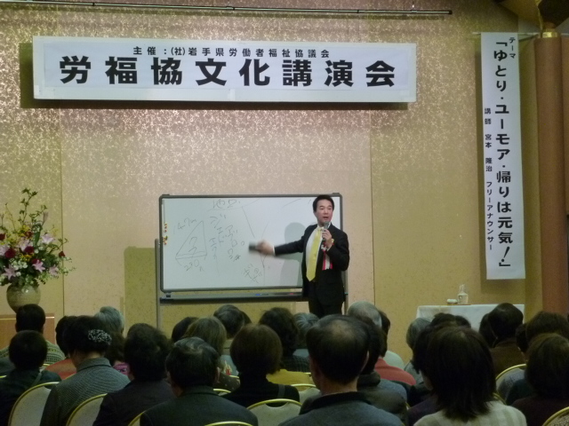 第10回労福協文化講演会をエスポワールいわて2階ホールで2月5日(土)に開催しました。『ゆとり・ユーモア・帰りは元気!』という演題で、NHKアナウンサーとして人気を集め、長年紅白歌合戦やのど自慢の司会をつとめ、現在はフリアナウンサーとしてご活躍中の宮本隆治氏にご講演をいただきました。