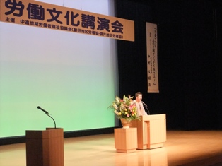 袋井市「メロープラザ」にて、クロフネカンパニー代表取締役社長『中村文昭氏』を講師に迎え『お金でなく 人のご縁ででっかく生きろ!』をテーマに、労働文化講演会が開催されました。