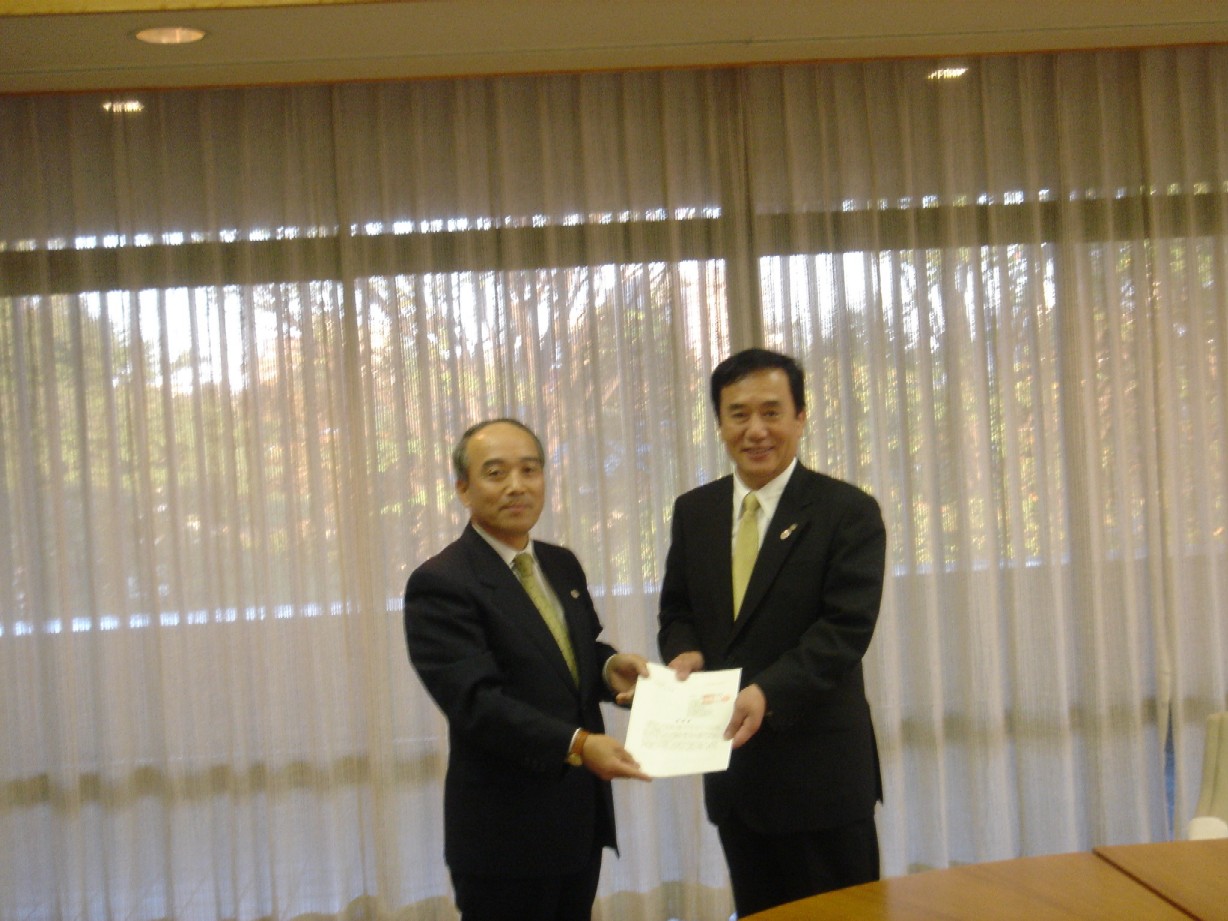 | 上田清司埼玉県知事に要請書を手渡す吉沢邦雄埼玉労福協理事長 |