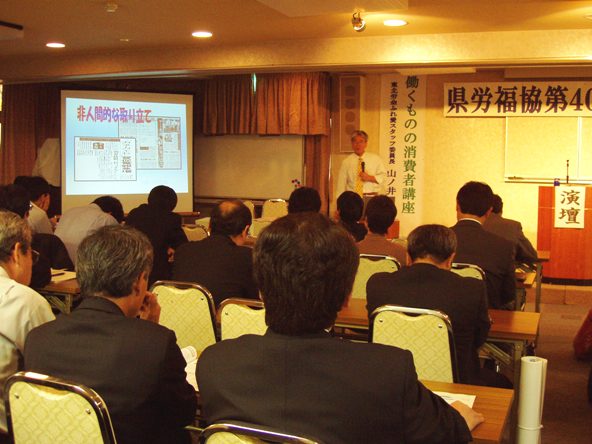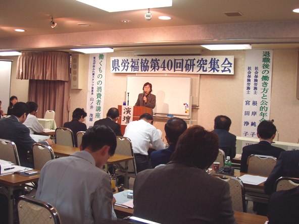 今年のテーマは世相を反映して1.働くものの消費者講座=講師 ろうきんふれ愛スタッフ委員長 山ノ井茂喜氏 2.退職後の働き方と公的年金のしくみ=社会保険労務士 根岸純子氏 社会保険労務士 宮田浄子氏を招いて講演をいただいた。