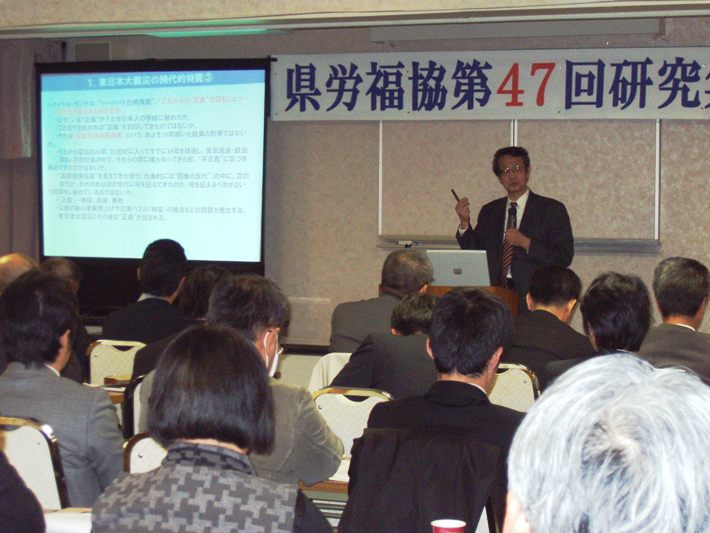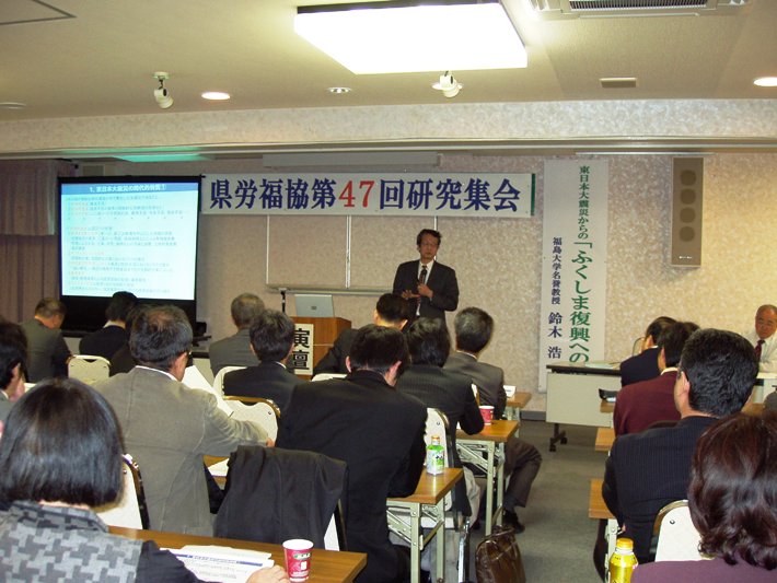 ◆第二部は東日本大震災からの「ふくしま復興への道」と題して福島大学名誉教授・福島県復興ビジョン検討委員会座長の鈴木浩氏より①東日本大震災の時代的特質、②震災があぶり出した生命・生活の軽視、③セーフティネット論と居住権保障④なぜ、「原子力に依存しない社会」を目指すのか⑤福島県復興ビジョン⑥災害救助法と応急仮設住宅問題⑦福島県における応急仮設住宅⑧大震災にしなやかに立ち向かうということ⑨地域社会・地域経済再生の課題について、それぞれ私達が容易に知りえない内容等についてお話をうかがうことが出来ました。