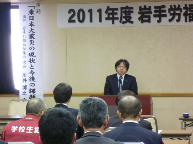 当日は、砂金文昭会長の主催者挨拶の後、(社)岩手日報社の川井博之氏(編集局次長兼記事審査部長兼論説委員)より『東日本大震災の現状と今後の課題』について~東日本大震災一連の報道から~と題してご講演いただきました。