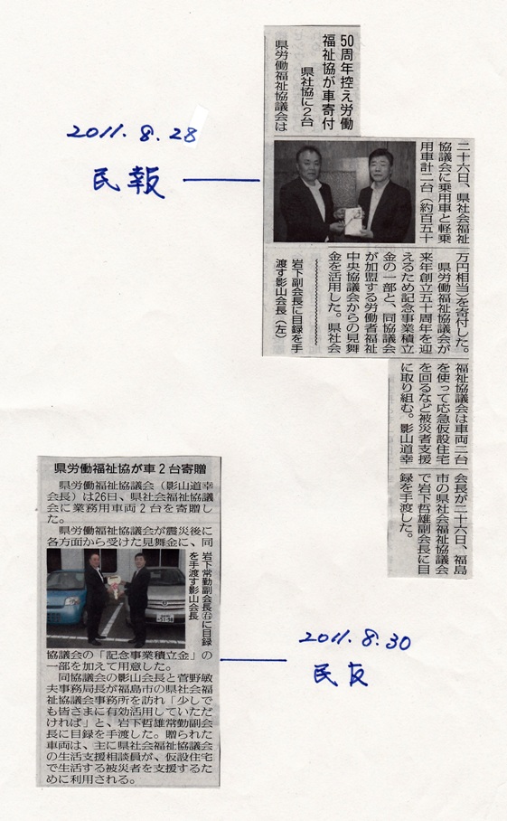 ◆福島県労福協では、その趣旨を活かすとともに2012年には創立50周年を迎えることから、記念事業積立金の一部も加え今後の復旧、復興に役立てていただくよう8月26日、福島県社会福祉協議会に業務用車両2台を贈呈いたしました。