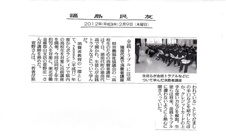 ◆2012.2.9福島民友新聞に掲載された「高校生のための消費者講座」猪苗代高校を紹介します。右画像を大きくしてご覧ください。