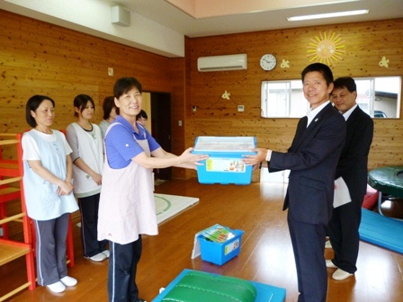 10月3日に袋井地区労福協役員・顧問が参加し、寄贈式が行われました。高橋会長から「労福協会員皆さんからの善意の寄贈です。大切に使ってください。」と教材が手渡され、「はぐくみ」施設長の吉岡さんからは、「子供達がとても喜びます。大切に使わせていただきます。」と感謝の言葉をいただきました。