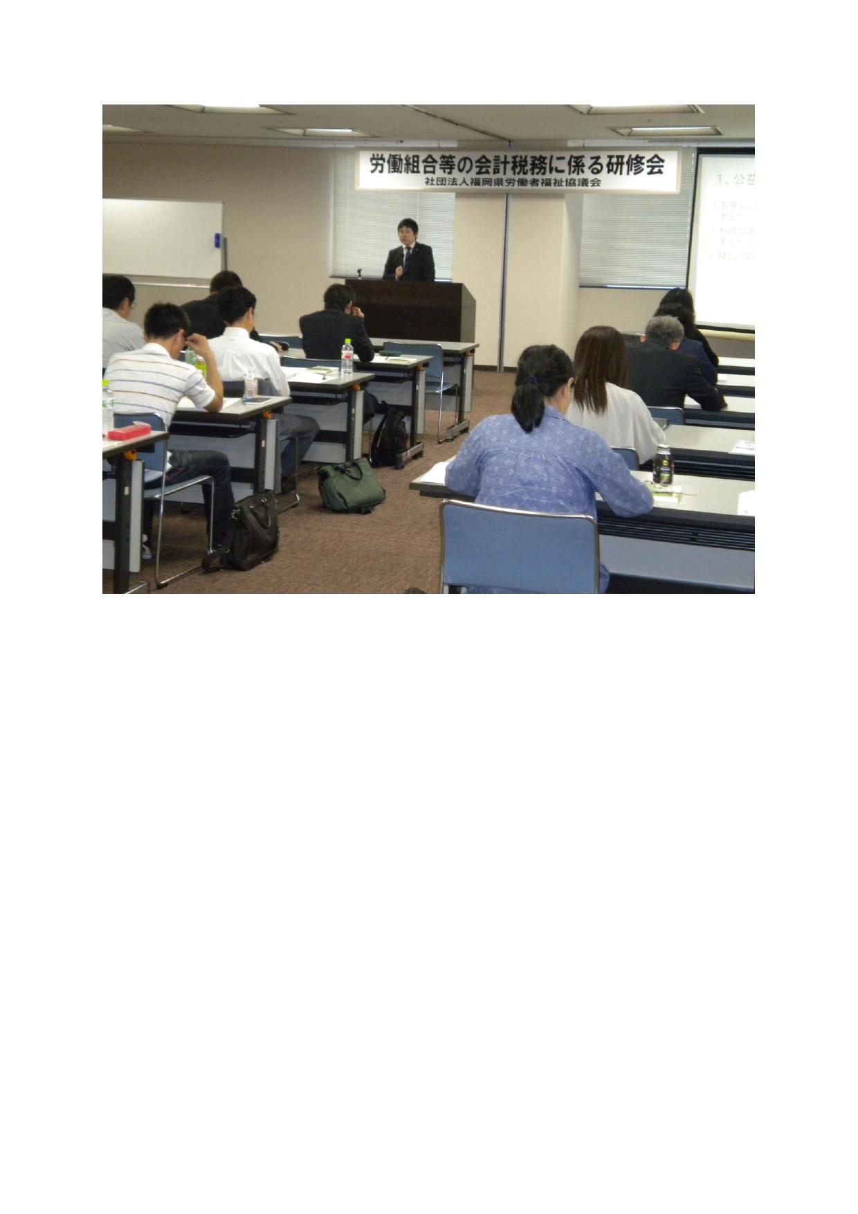 「労働組合の会計税務に係る研修会」を福岡市博多区・中小企業振興センターにおいて開催しました。研修会には、統合経営システムパートナー公益法人部部長の藤永哲嗣税理士を講師に招き、県内から17団体27名の役職員の方が参加され、13時30分から16時30分まで3時間にわたり熱心に受講されました。