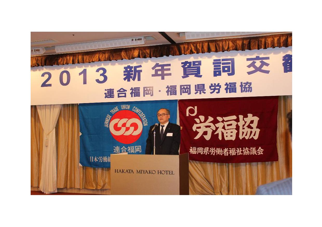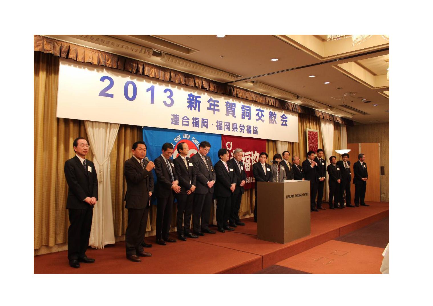 連合福岡・福岡県労福協共催の2013新年賀詞交歓会を1月8日(火)17時より博多都ホテルで開催しました。賀詞交歓会には、福岡県知事、北九州市長、福岡市副市長、福岡労働局長、福岡県経営者協会会長、国会議員、構成団体代表者など関係者約180名の参加を頂きました。