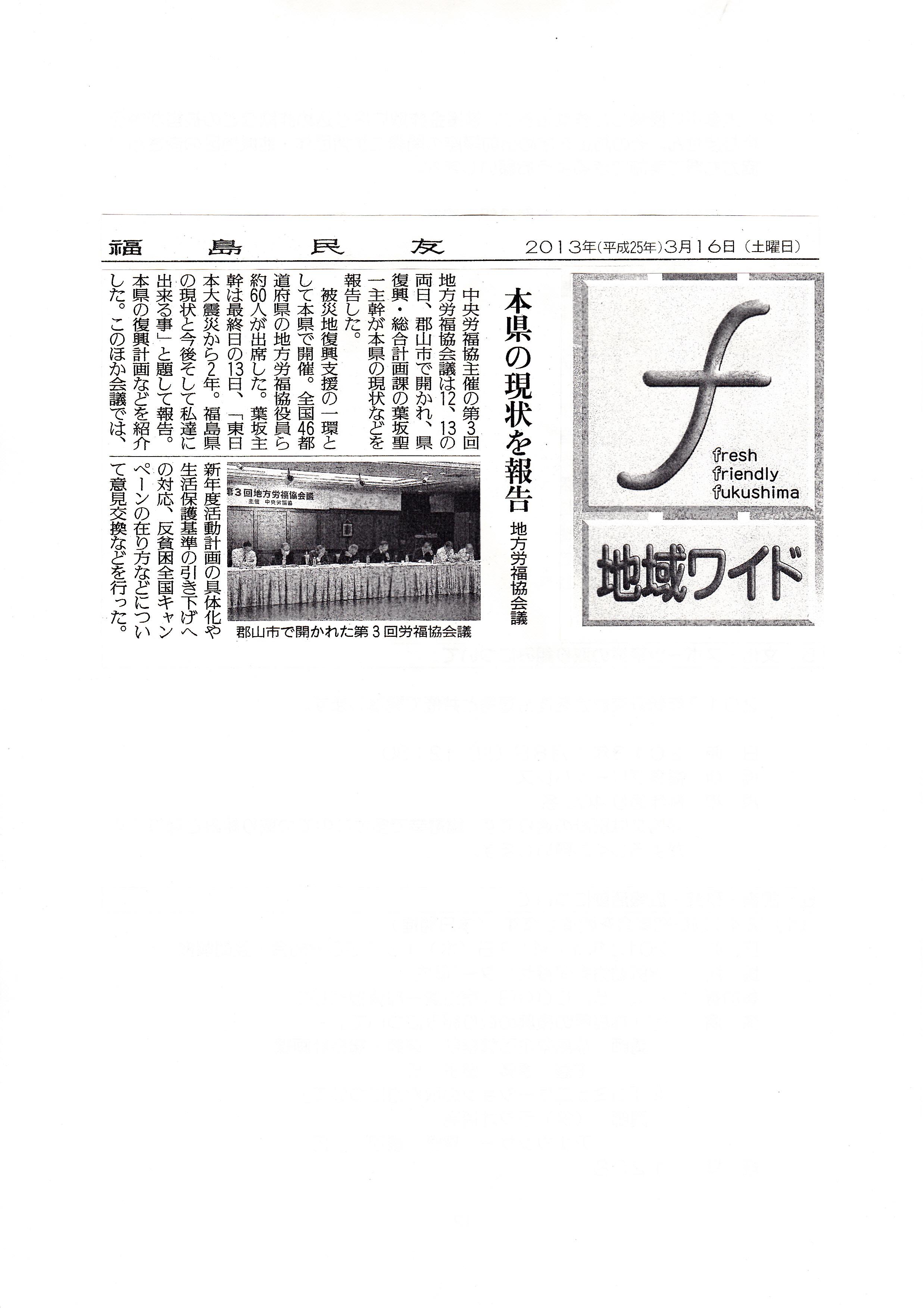 ◆3月12日~13日、全国から62名の役員が出席をして中央労福協第3回地方労福協会議が郡山市において開催されました。本県で開催されたのは東日本大震災から2年目を迎え被災地支援の一環としての取り組みとなりました。