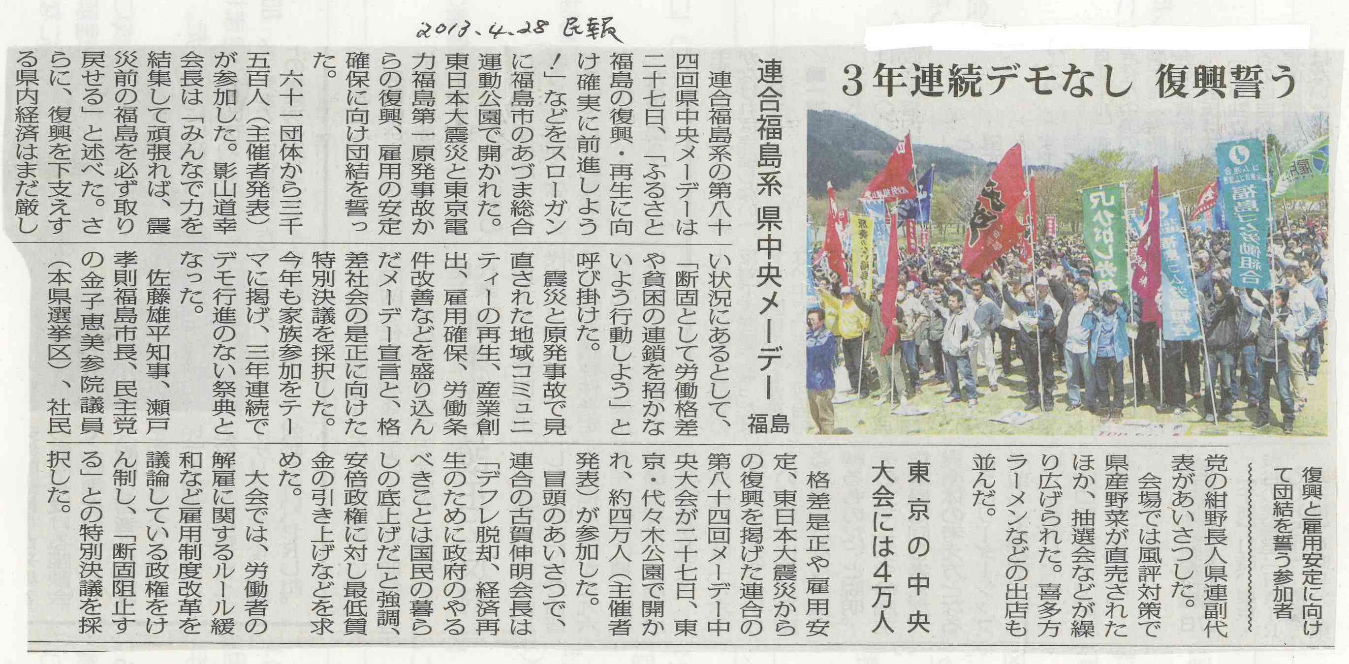 ◆「ふるさと福島の復興・再生に向け確実に前進しよう」をスローガンとする第84回福島県中央メーデーが61団体3.600名の参加を得て福島市あづま総合運動公園で開催されました。