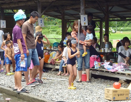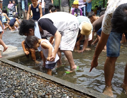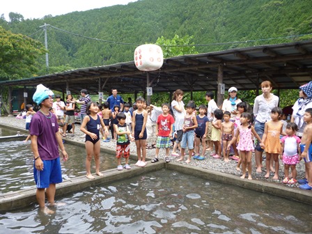 会長の挨拶の後、さっそく子供達はイケスに入り175匹の放流された「あゆ」を捕まえました。初め小さなお子さんは「あゆ」に恐る恐るでしたが、慣れてくると「あゆ」を追いかけ、ぴちぴちしている感触に歓声をあげていました。