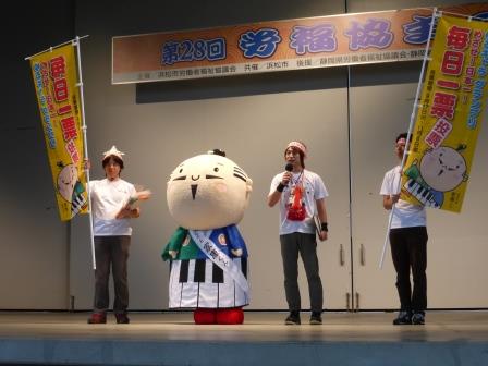 約8,000人のお客様に来場いただきましたが、昨年の半分以下となり浜名湖ガーデンパークで開催して初めての大雨に見舞われ労福協役員・スタッフも厳しい一日となりました。しかし、チャリティバザー・親子工作広場。キャラクターショーは相変わらずの人気でした。今年は、浜松市のキャラクター「家康くん」も雨の中を来場者と交流し、ステージでも踊って人気者になっていました。