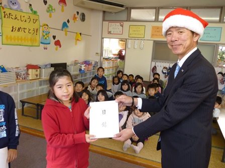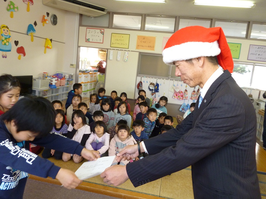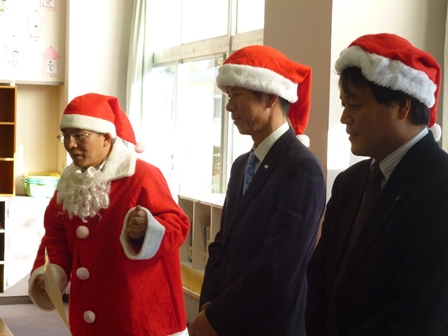 この日はちょうどクリスマスイブで、高橋会長から「労福協会員皆さんからの善意のプレゼントです。みんなで楽しく遊んでください。」と、お買物遊びができる玩具やブロック、サッカーボールなどを手渡し、子供たちに喜んでもらいました。