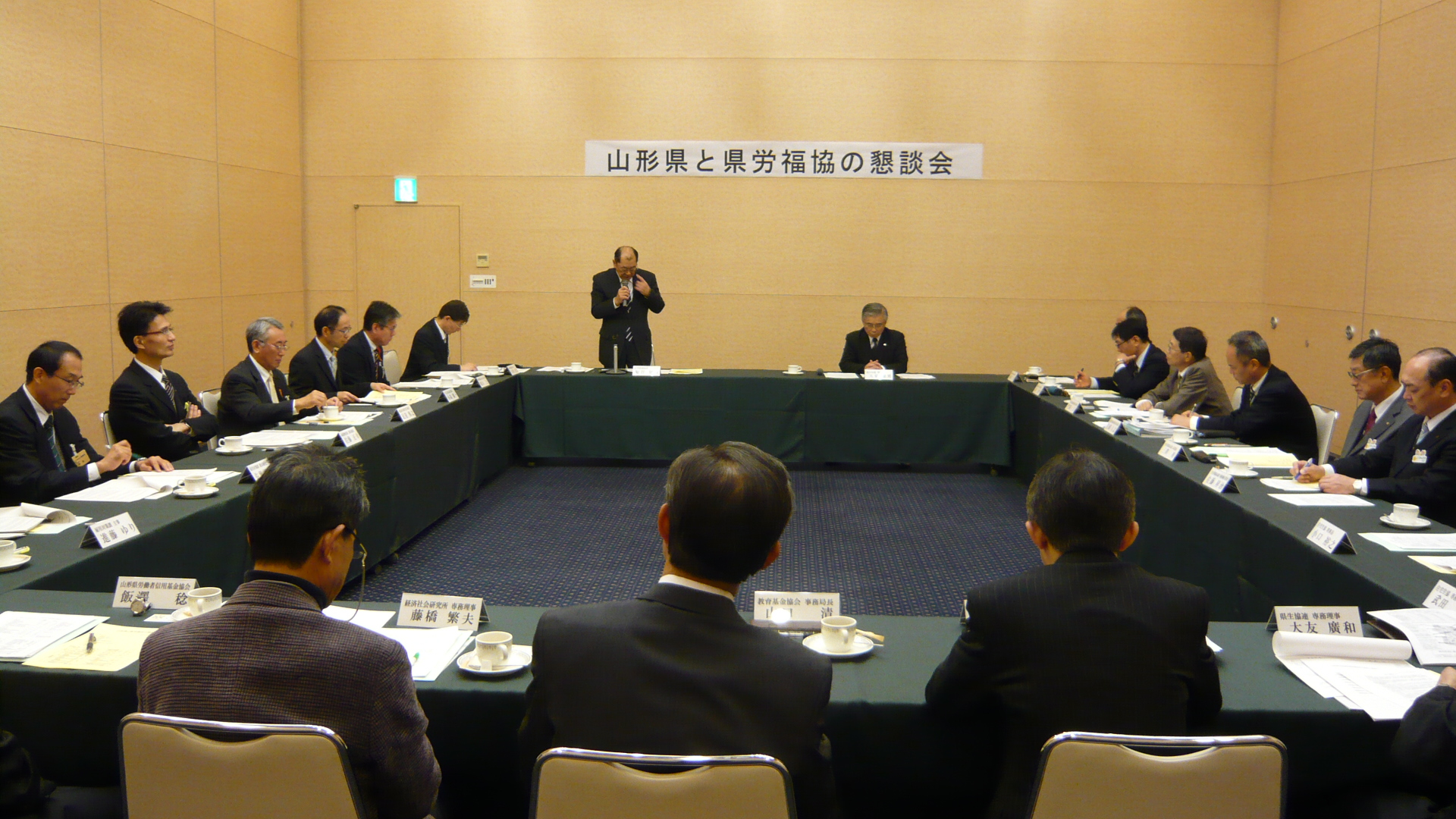 「山形県と県労福協の懇談会」を開催し、山形県からは細谷副知事をはじめ、健康長寿推進課長寿安心支援室長、雇用対策課長、くらし安心課長、食品安全衛生課長、高校教育課長補佐ら計8名が出席、県労福協側は各加盟団体代表者など14名が参加しました。