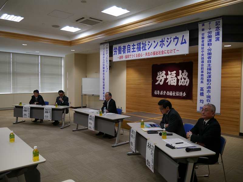 ◆パネルディスカッションは「これからの労働者自主福祉運動を考える」と題して、コーディネーターに高橋講師、パネラーは加藤光一連合福島事務局長、加藤公一東北労働金庫福島県本部副本部長、岩井修一全労済福島県本部専務執行役員、林彪県労福協事務局長。それぞれの立場で労働者自主福祉運動をすすめるにあたっての現状と課題について討論が行われました。