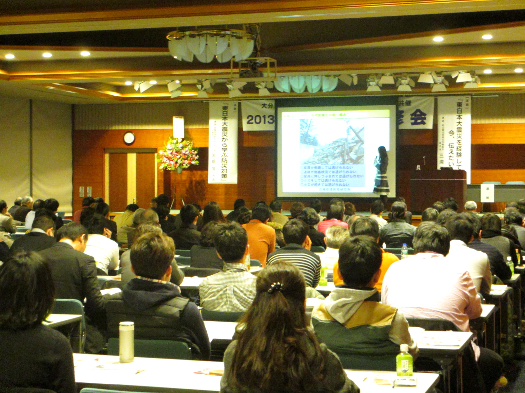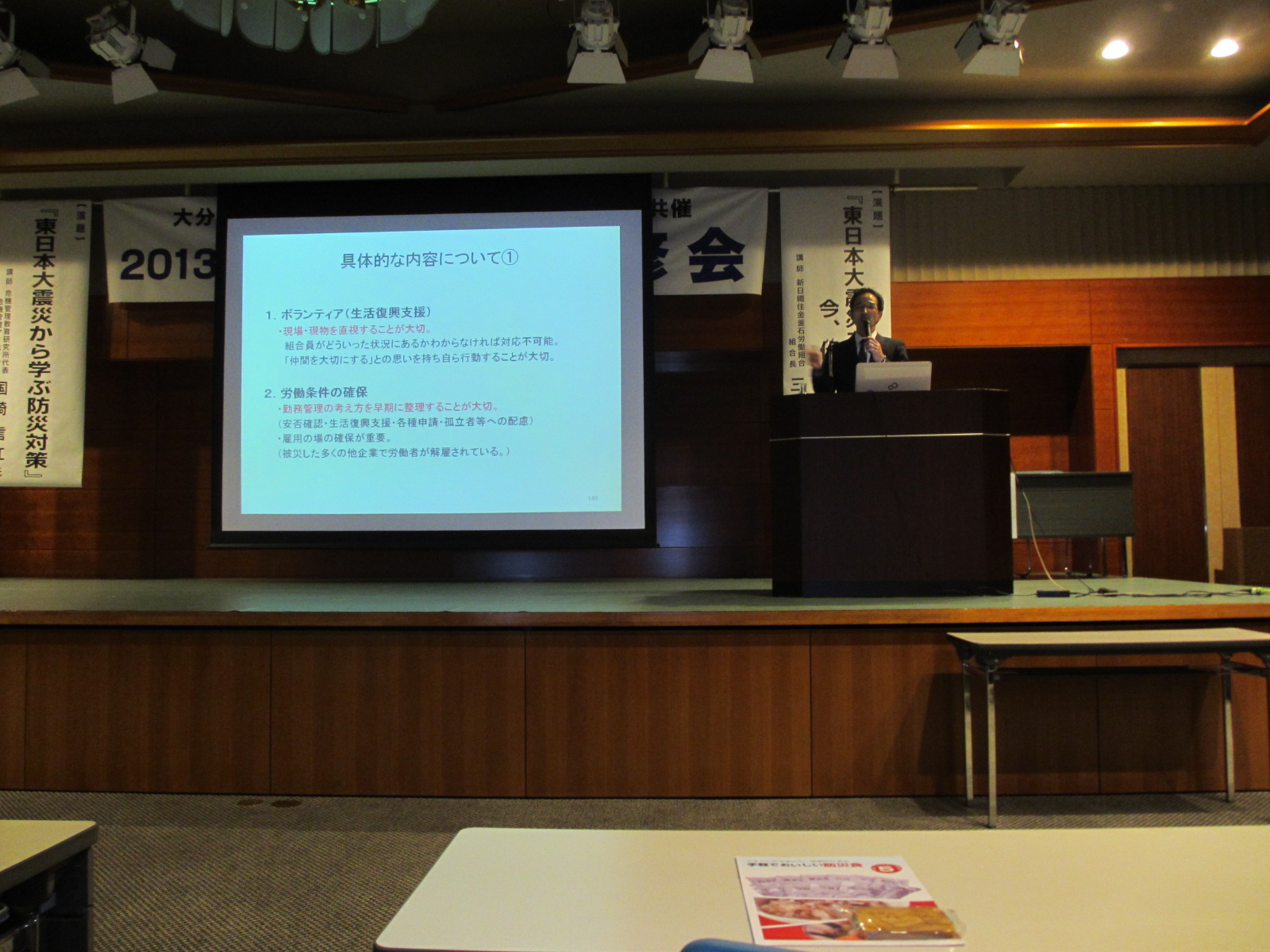県労福協は、勤労者・県民の福祉と生活の向上に役立つ研修会を県労福協と全労済大分県本部の共催で2月23日(日)13時30分 大分市中央町ソレイユにおいて、会員ならびに一般から160名が参加すする中で研修を行いました。開会に先立ち、主催者あいさつを村田理事長ならびに嶋本部長より行い、研修会に入りました。今回の研修会は、東日本大震災の体験報告と今後の防災対策の二部構成で行いました。第1部の講師に新日鐵住金釜石労働組合 組合長の三浦一泰氏を招いて、「東日本大震災を経験して、今、伝えたいこと」と題して、震災直後の組合員や住民への非難対応や被災者の救援等につ