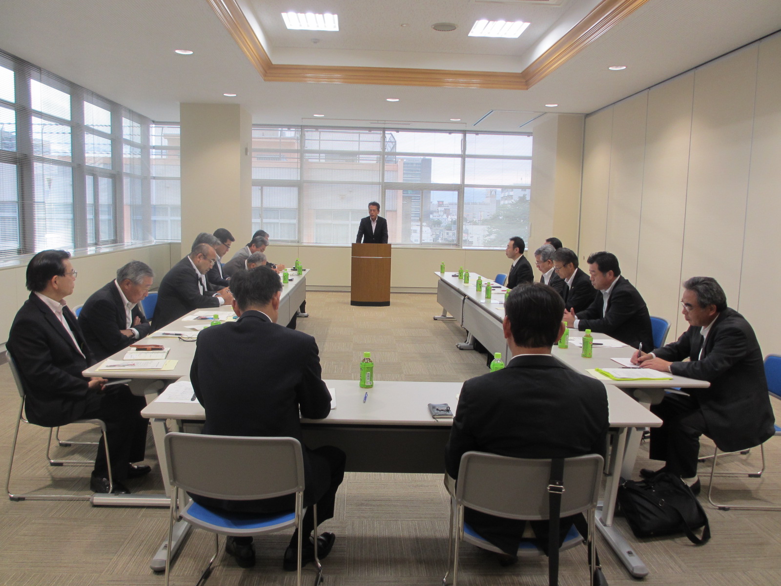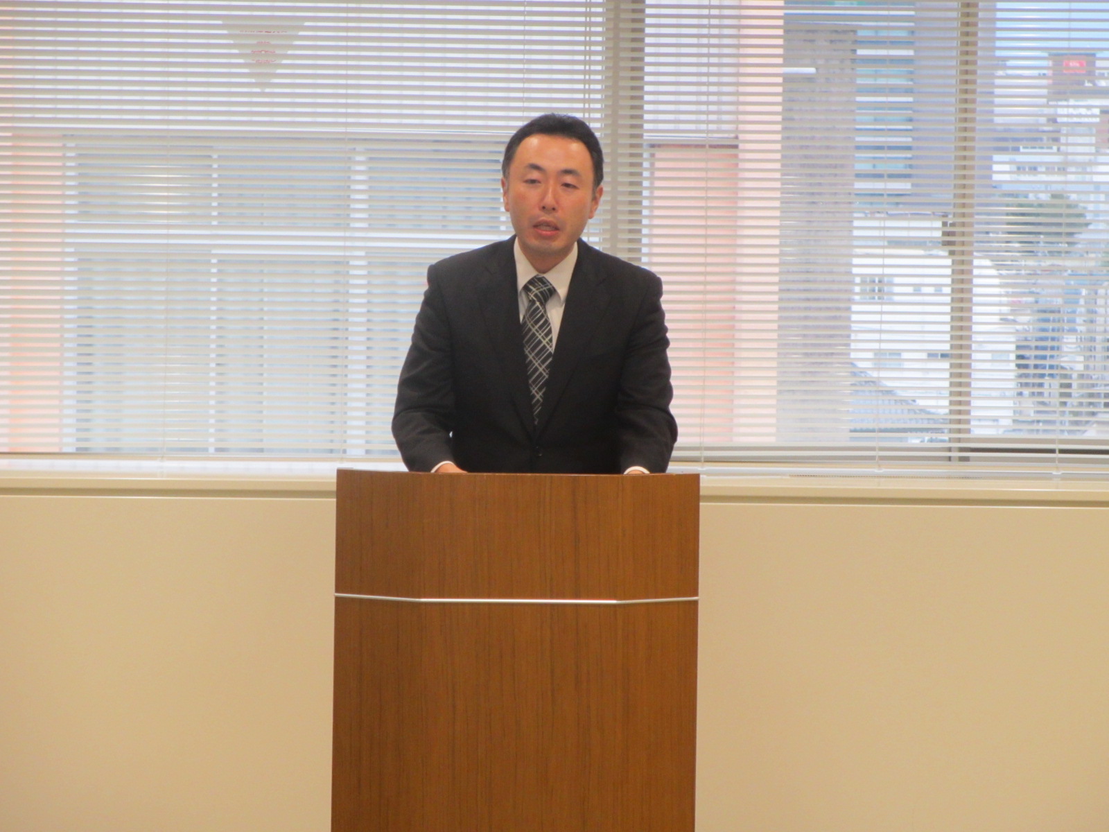 | 福島県労福協今泉会長あいさつ(正面)、南部労福協の参加者(左側)、福島県労福協の皆さん(右側) |
