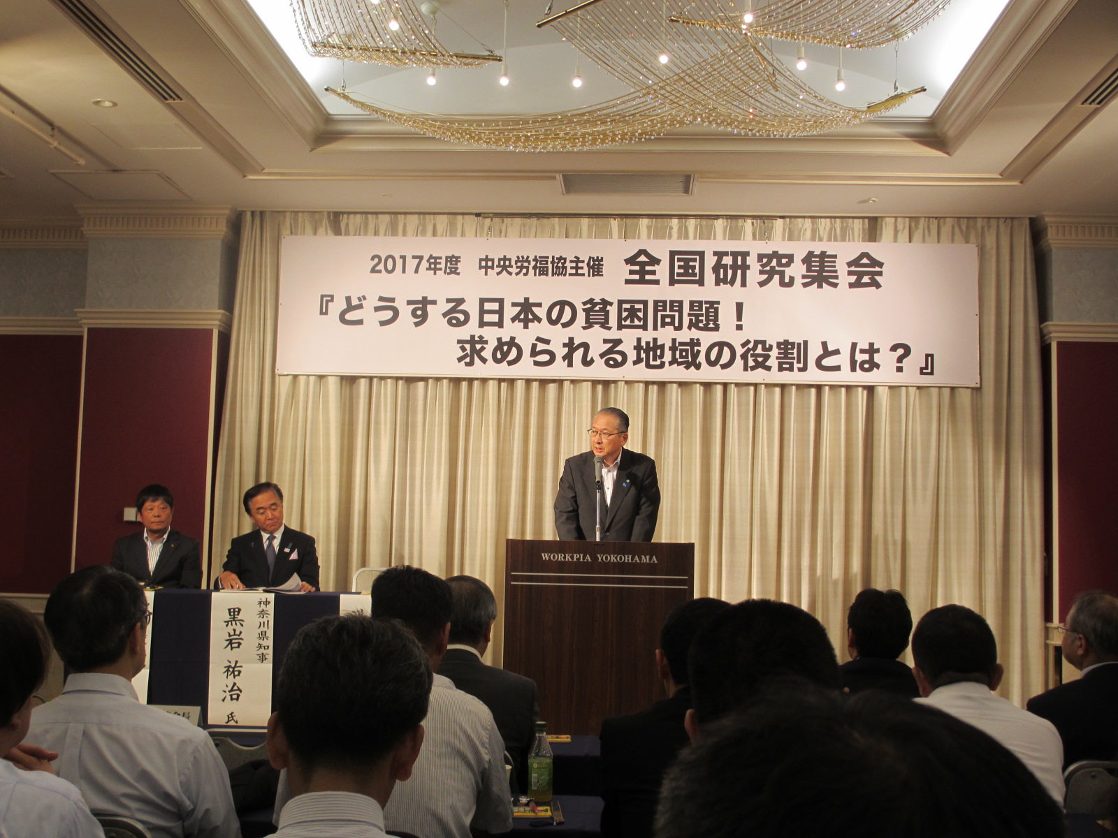 冒頭、主催者を代表して神津里季生会長が今年度の全国研究集会の開催趣旨についてあいさつがあり、来賓あいさつでは神奈川県労福協の柏木教一会長ならびに神奈川県の黒岩祐治知事から歓迎のあいさつがありました。