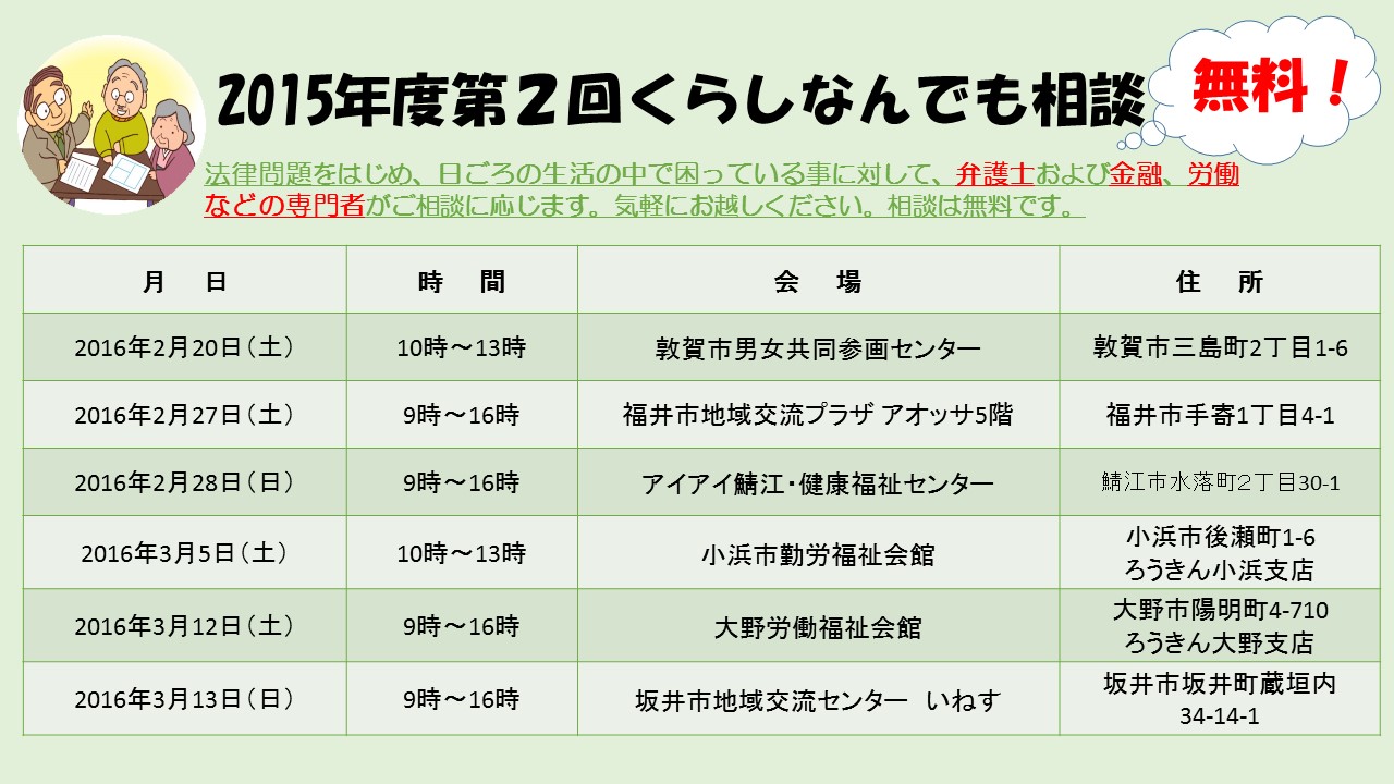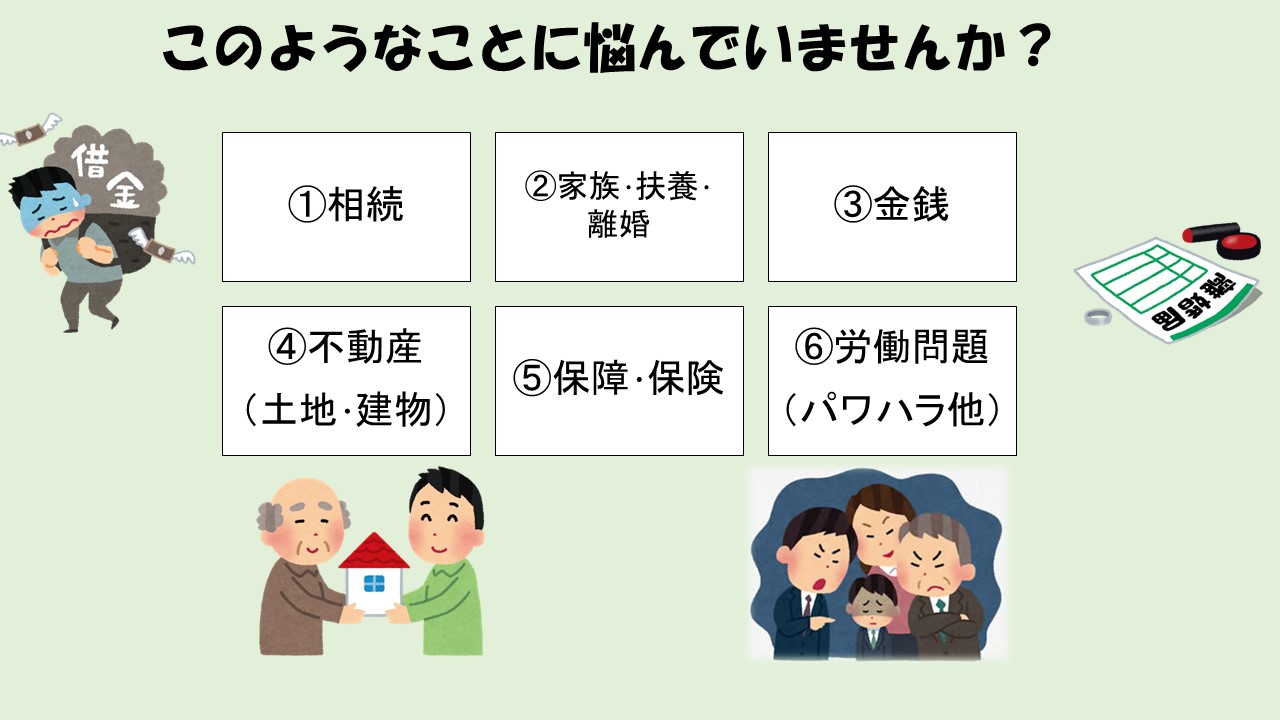 法律問題をはじめ、日ごろの生活の中で困っている事に対して、弁護士および金融、労働などの専門者がご相談に応じます。 気軽にお越しください。相談は無料です。