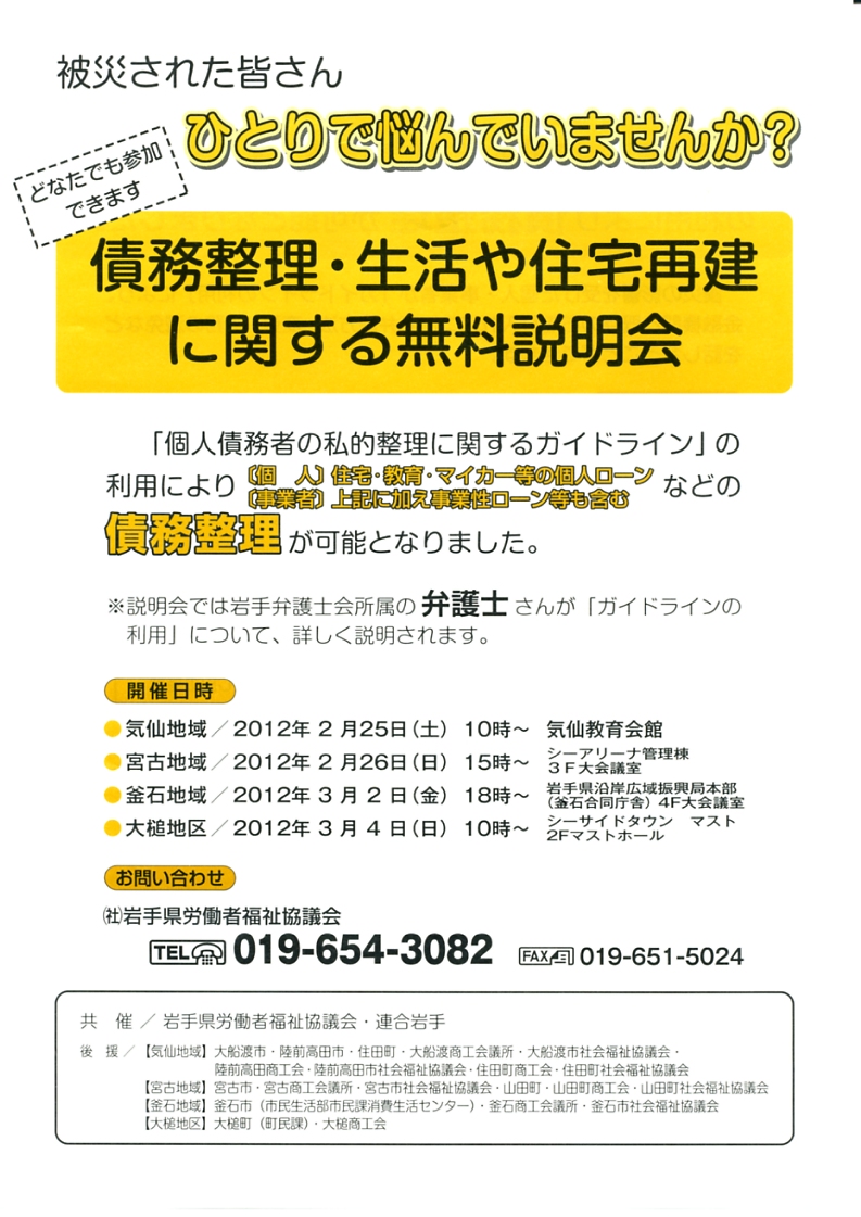 被災者対応「債務整理・生活や住宅再建に関する無料説明会」in大船渡 |