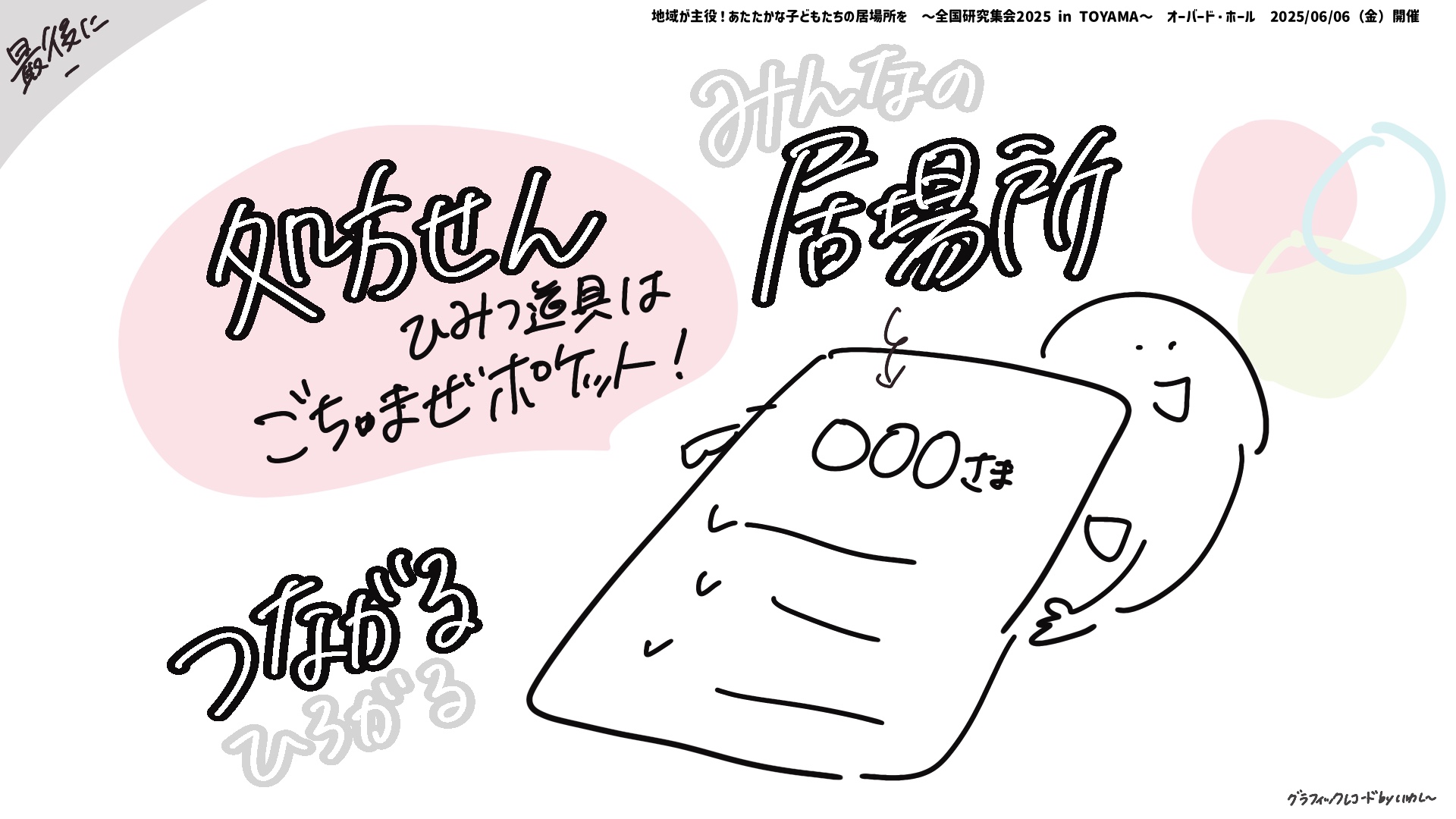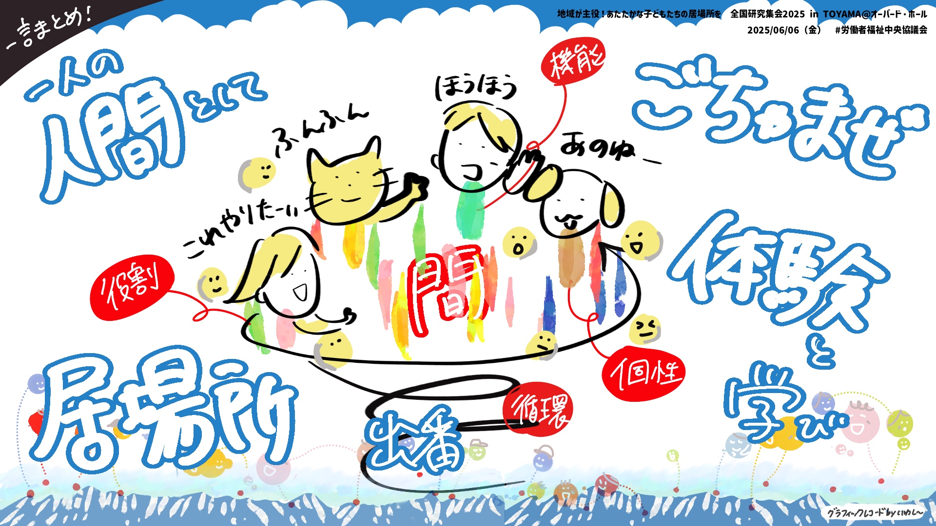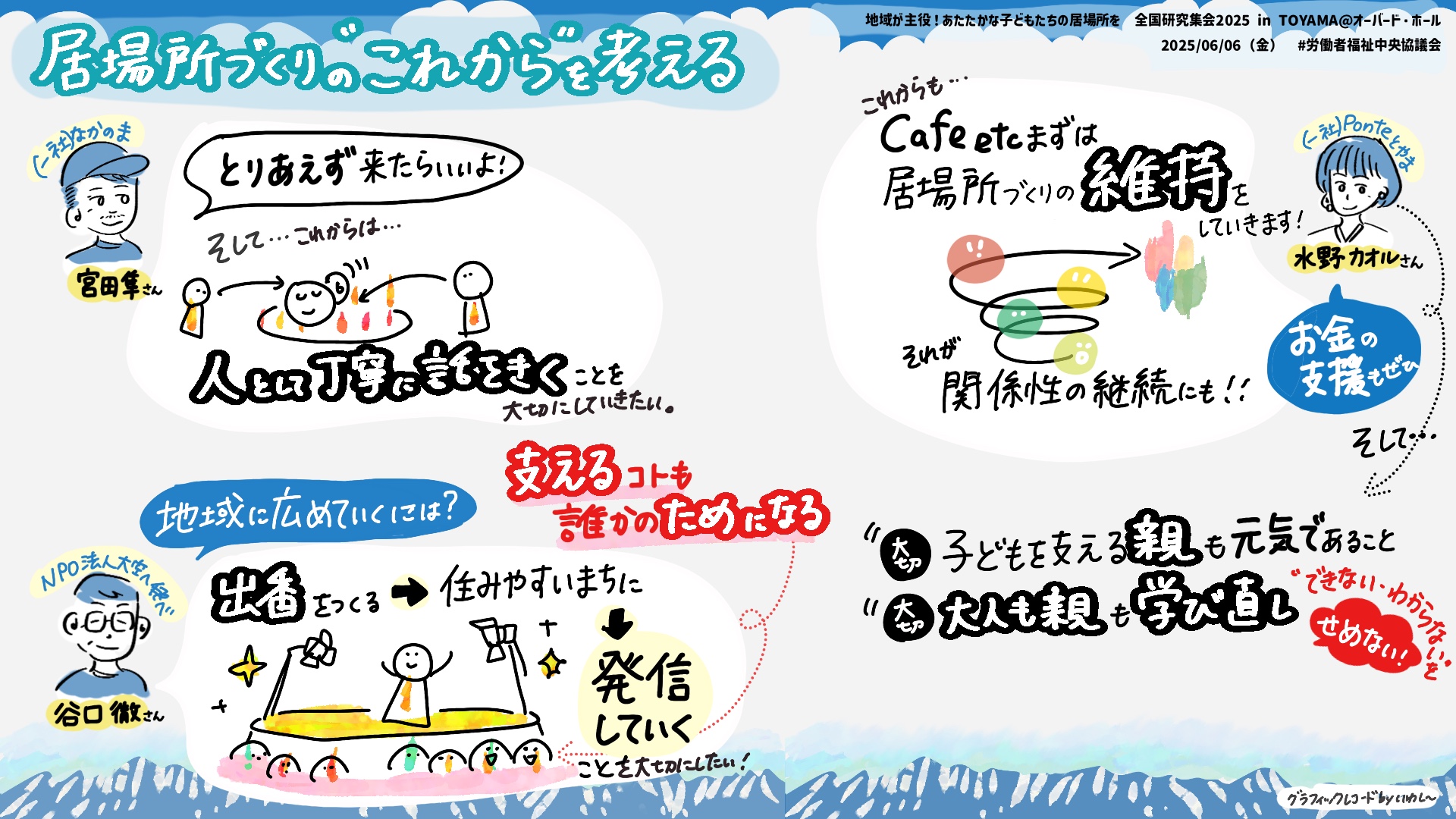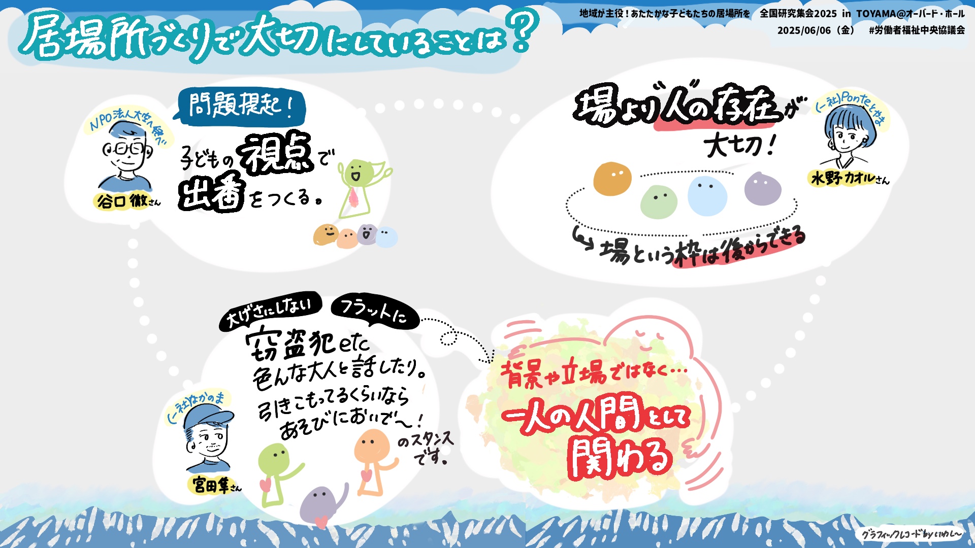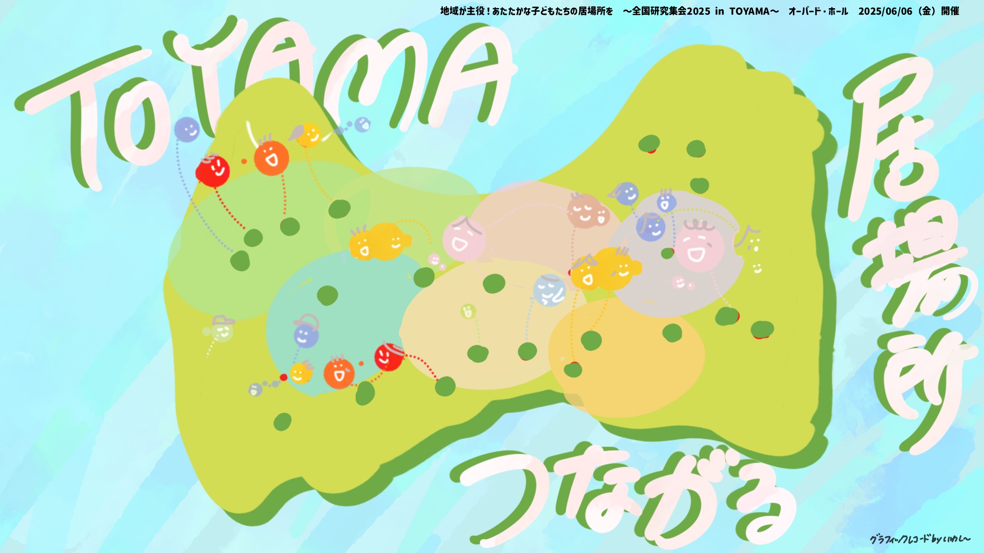 そして今回の富山では、子どもたちがより輝いて自己を表現できる場所、安心して過ごせるあたたかな居場所を地域にいかに築いていくか、また、未来の日本社会を担う子どもたちが夢を抱きながら成長することができる地域社会のあるべき姿はどのようなものか、実践者たちを招いて考察します。