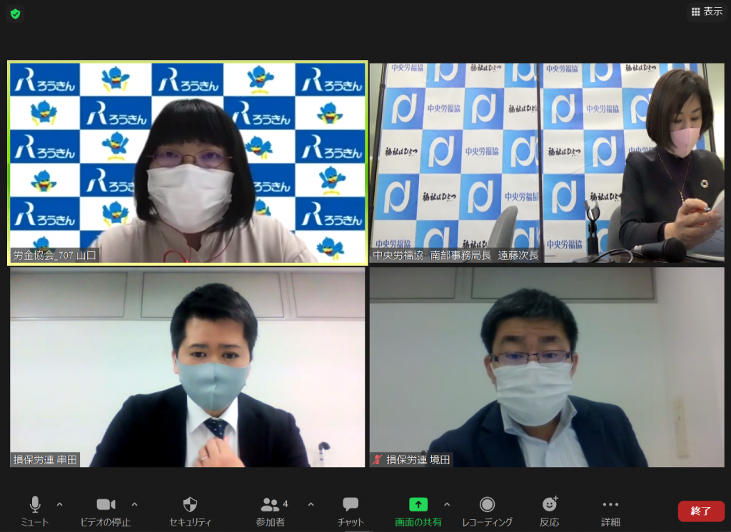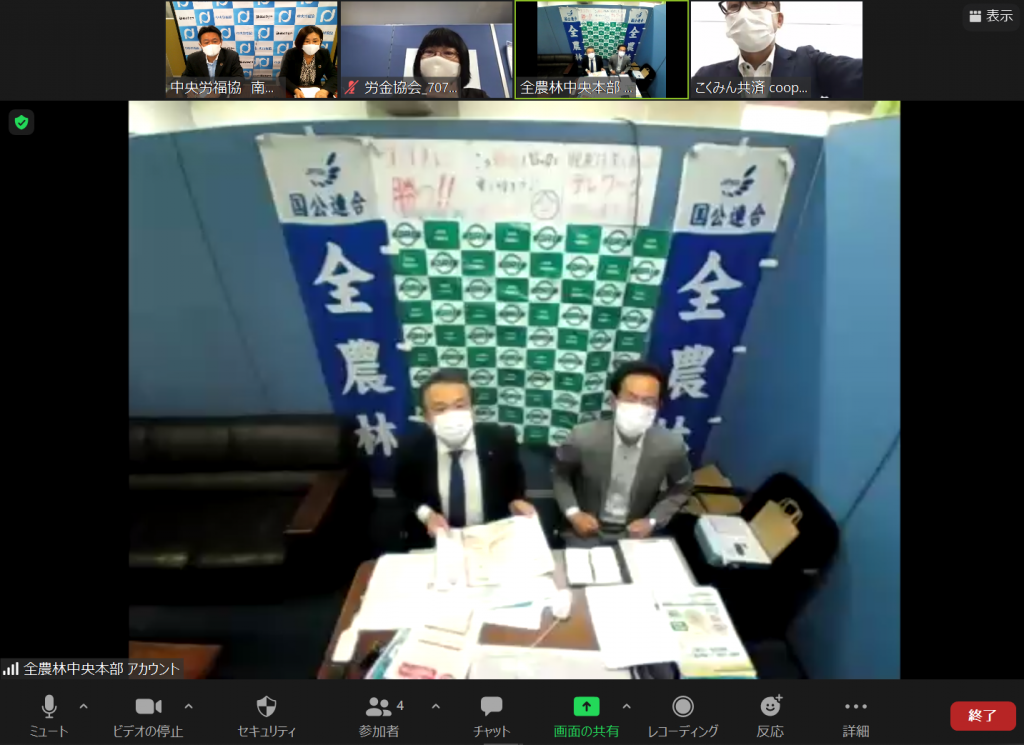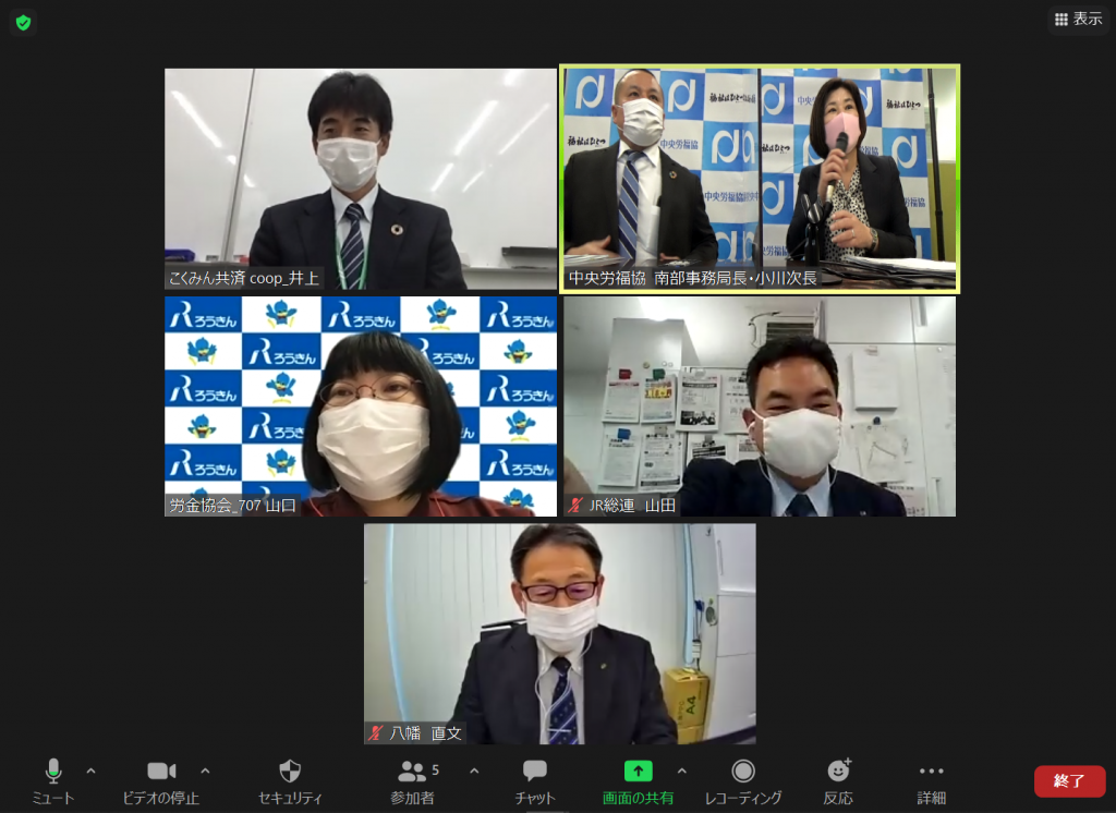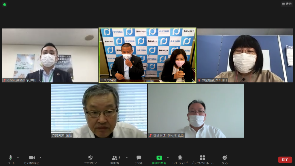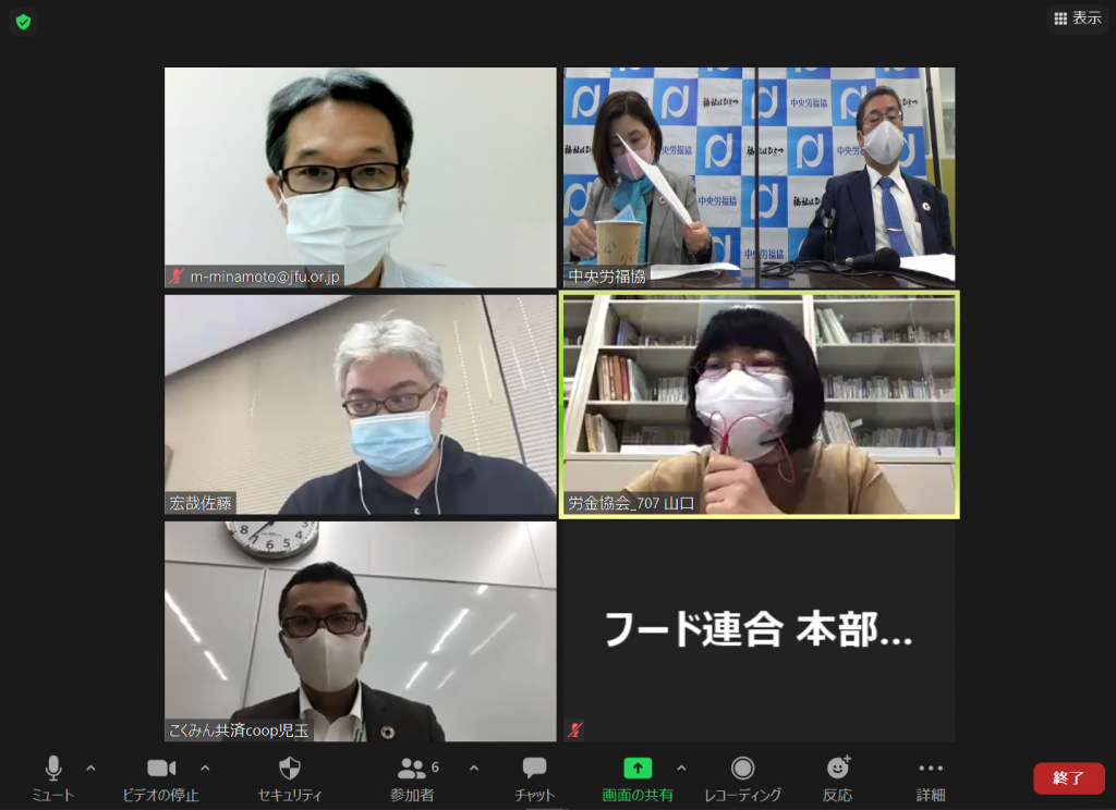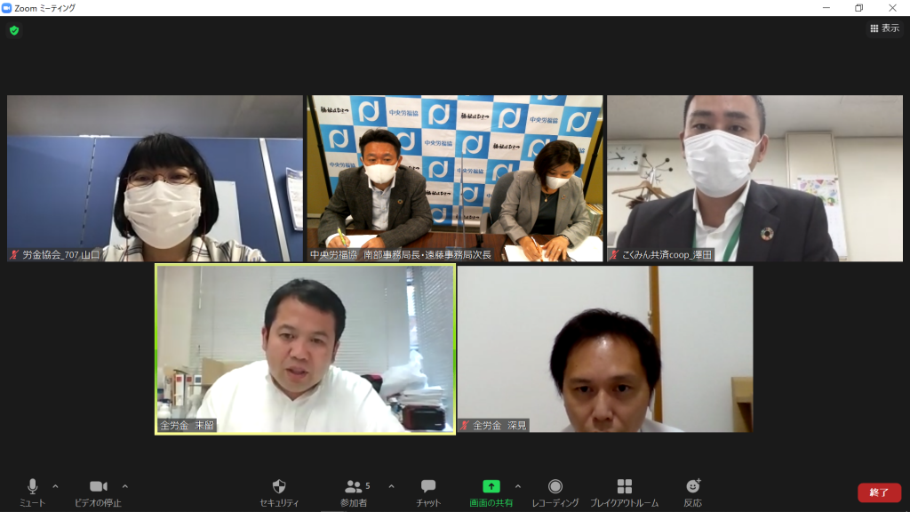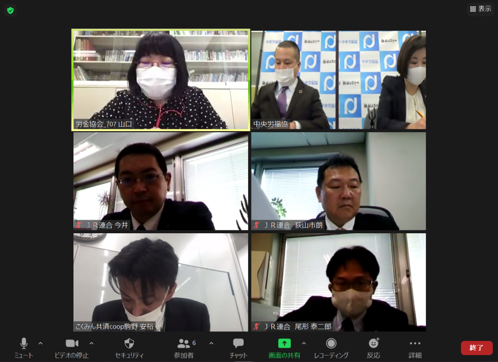 中央労福協は10月14日、労金運動中央推進会議・こくみん共済coop中央推進会議との三者で、労働金庫や労働者共済など労働運動自らがつくり育ててきた労働者自主福祉事業の歴史を踏まえ、あらためて労働運動の一環として位置づけていただくために、共同して各労働組合へ要請を行った。14日はUAゼンセンを皮切りに4つの労働団体のトップ(三役)にZoomによるWeb訪問を行い、併せてJP労組へも対面訪問した。