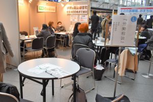 イベントはオープンスペースで開催され、介護に関わる企業ブースが設けられたほか、介護保険、住まい、仕事と介護の両立などテーマごとに相談テーブルを設け、中央労福協は、連合、高齢社会をよくする女性の会とともに労働相談を担当した。