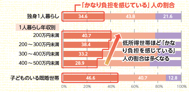 さらに年収別に見ると、独身1人暮らしでは、低所得世帯ほど住居費負担率が高くなる傾向がみられ、「かなり負担を感じている」と回答する人の割合も高くなることが分かりました。