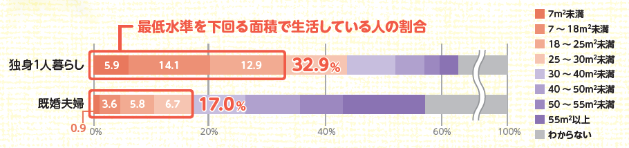 - 独身1人暮らしの3割強、既婚夫婦の2割弱が最低居住面積を下回る水準で生活している
