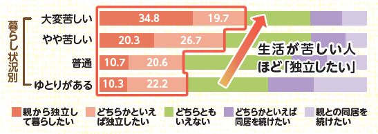 さらに暮らしの状況別にみると、現状の生活を「苦しい」と感じている人ほど「独立したい」と回答する割合が高くなっており、実家を出たいと考えながらも、経済的な理由からそれがかなわない層が少なくないことが示されています。