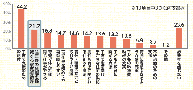 若い世代が安心して結婚・子育てを行うために必要なことについて、13項目の中から3つ以内で選択してもらったところ、「子育て世帯のための給付」が44.2%と最も多く、次いで「住居費の負担を軽減する家賃補助等」が21.7%となりました。
