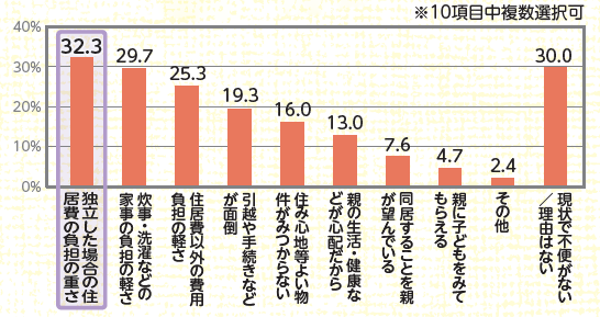- 親と同居している人のうち4割が独立を希望する一方、3割は「独立した場合の住居費負担の重さを理由に同居を継続